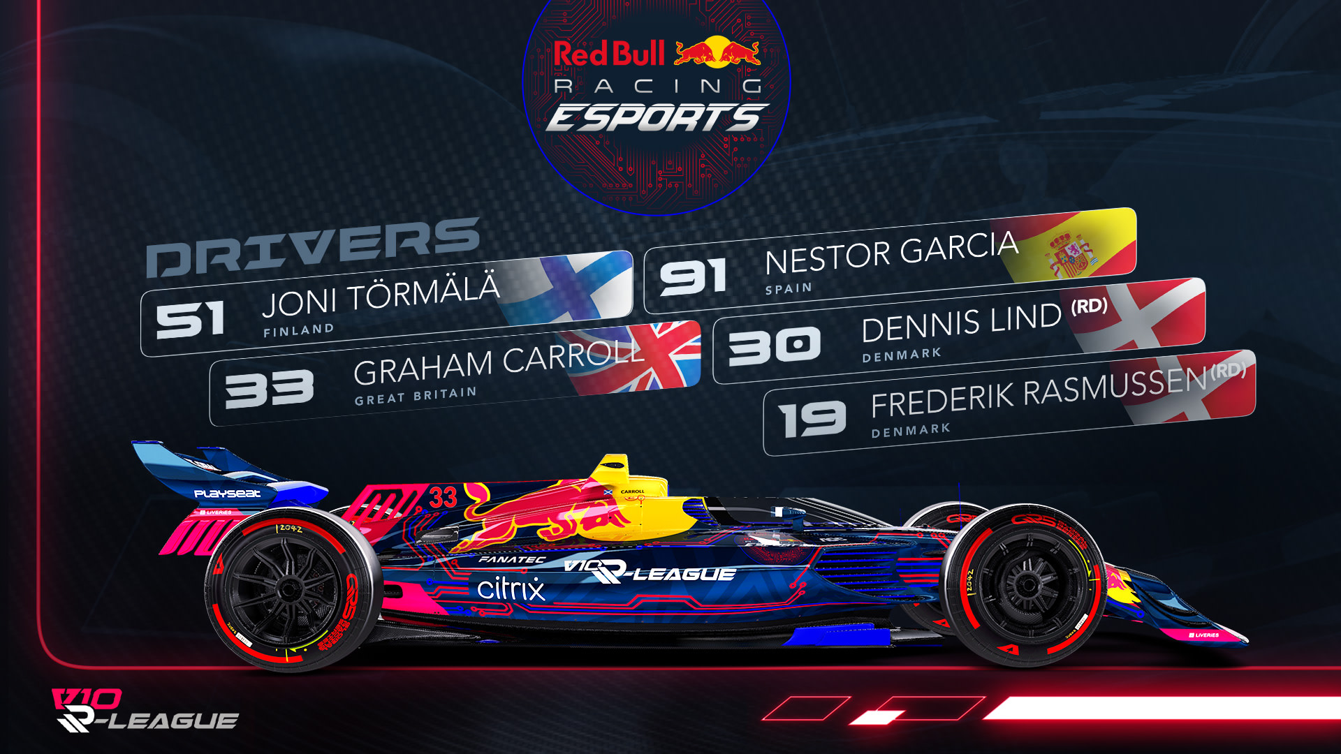 Neben Carroll startet der Spanier Néstor García in der V10 R-League für Red Bull Racing Esports, der erst seit 2018 im Sim-Racing aktiv ist und bereits auf einige Erfolge zurückblicken kann. Darunter im Jahr 2019 Siege im Assetto Corsa Carrefoure eT Madrid und Carrefore eT A Coruña. Im Jahr 2020 trat García im ADAC GT Masters eSports an.