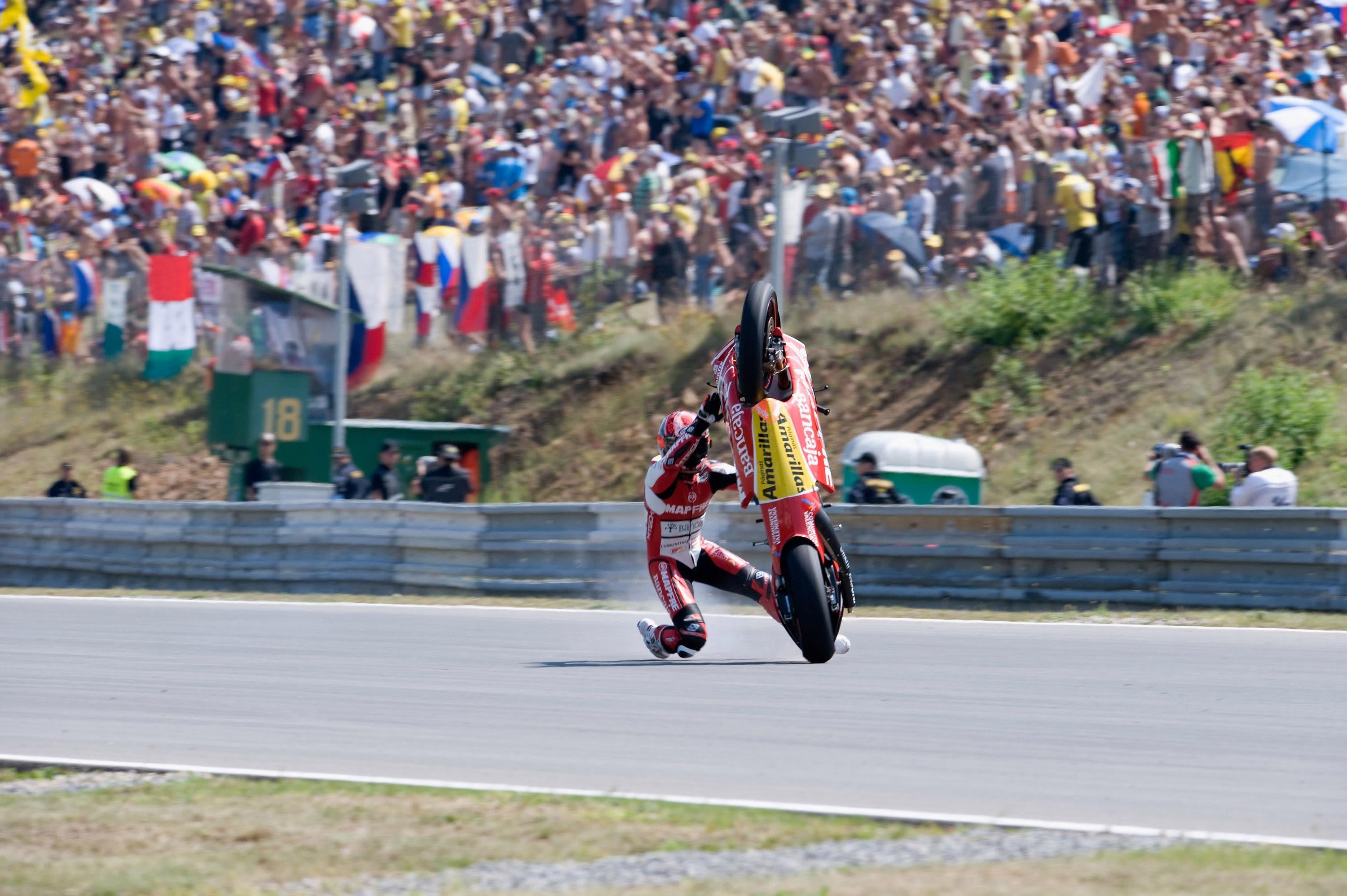 Dieses spektakuläre Missgeschick passierte nach dem Rennen der 250er Klasse in Brünn. Bautista, der noch um den WM-Titel mitfuhr, war gerade beim tschechischen Grand Prix auf Platz drei gefahren. Das wollte er mit einem Wheelie vor der Tribüne feiern.