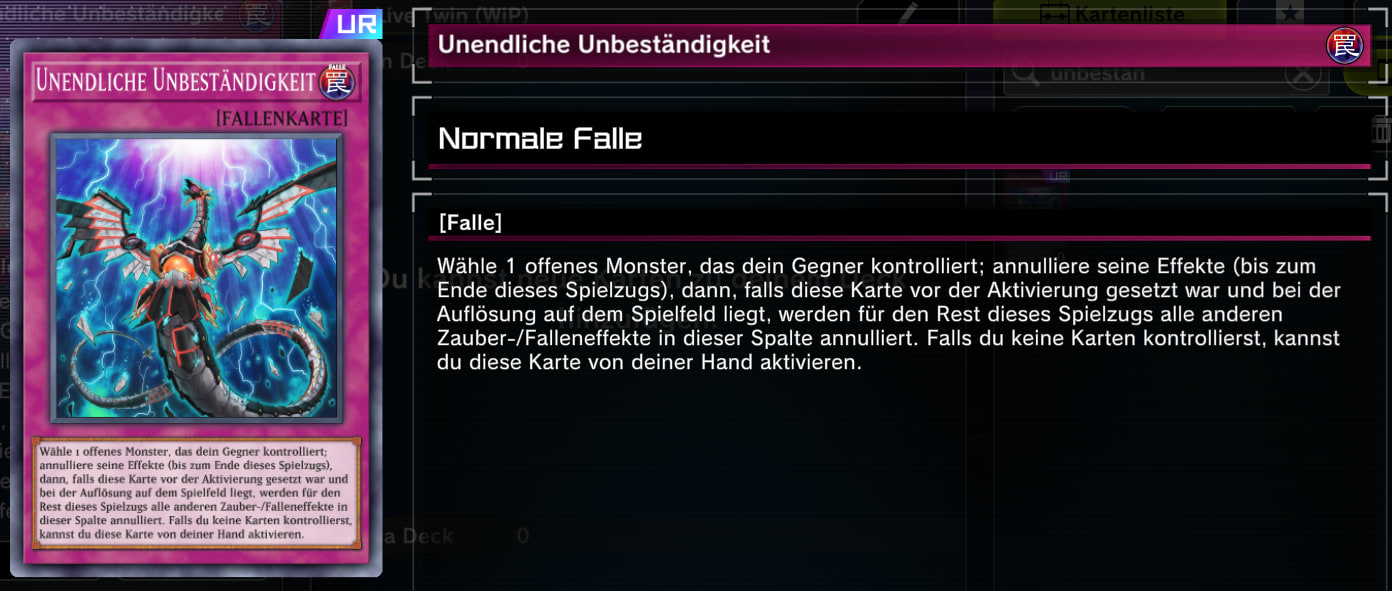Solltet ihr keine Karten auf dem Spielfeld habt, könnt ihr Unendliche Unbeständigkeit direkt von der Hand aktivieren. Allerdings verliert sie dann ihren Zusatzeffekt, der eine Zauber-, oder Fallenkarte annulliert.