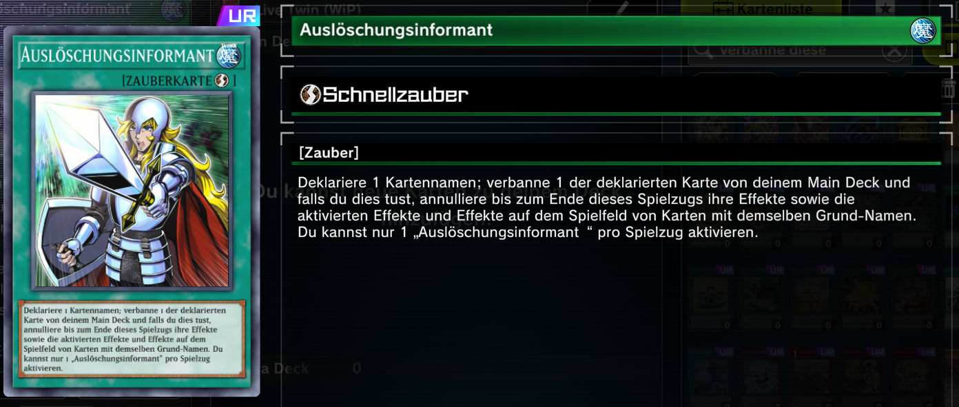 Eine weitere Waffe gegen Handtraps ist der Auslöschungsinformant. Allerdings setzt er voraus, dass ihr die zu annullieren die Karte selbst im Deck habt. Wird der Effekt eines Monsters aktiviert, könnt ihr diese entsprechende Karte auf eurem Deck verbannen und dessen Effekt verhindern. Als Bonus werden auch die Effekte aller Feld-Monster mit diesem Namen ebenfalls unterbunden. Das bedeutet ihr könnt nicht nur Handtraps kontern, sondern auch schützende Effekte von Kreaturen auf dem Board übergehen.