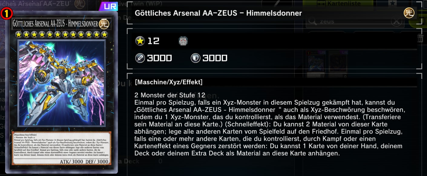 Obwohl Zeus ein Rang 12 XYZ-Monster ist, fällt es vielen Decks leicht den Mecha zu beschwören. Immer wenn eines eurer XYZ-Monster gekämpft habt, könnt ihr Zeus über dieses beschwören und alle darunterliegenden Karten als Material benutzen.
