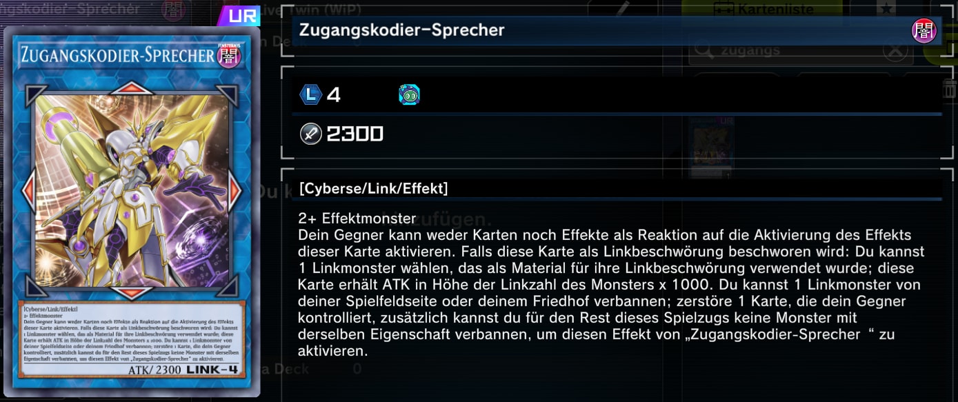 Als Link-Monster mit sehr generischen Beschwörungsskriterien ist der Zugangskodier-Sprecher eines der aktuell am meisten gespielten Finisher. Oft wird unter anderem ein Link-Monster der Stufe 2 oder 3 geopfert, um ihn auf das Feld zu bekommen. Das erhöht seine Stärke auf einen Wert von bis zu 5300. Doch damit nicht genug. Zusätzlich kann er ein Link-Monster aus eurem Friedhof verbannen, um ein Karte des Gegners zu zerstören. Sollte sich also auch noch eine verdeckte Karte auf dem Feld befinden, die euren Gegenüber potentiell retten könnte, wird auch diese entfernt.
