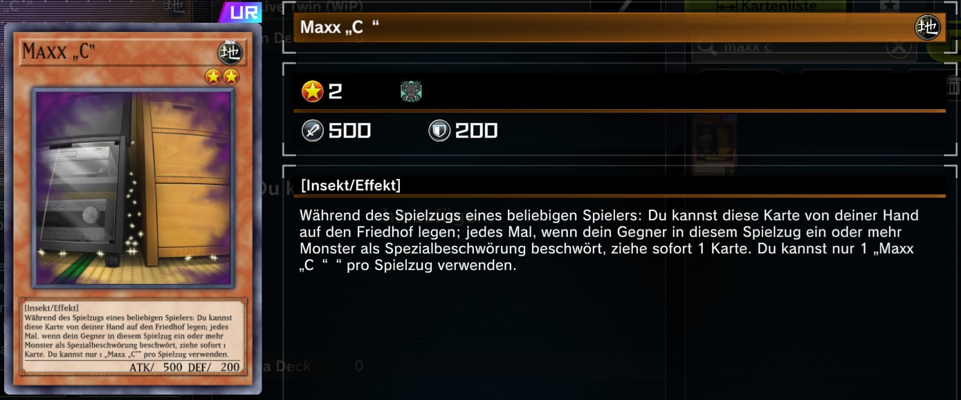 Die Strategien vieler Decks bauen darauf auf, dass man über eine Reihe von Spezialbeschwörungen eine starke Board-Präsenz generiert. Maxx “C” gibt euch die Möglichkeit für jede Spezialbeschwörung des Gegners eine Karte zu ziehen. Auf diese Weise beginnt ihr euren Zug mit einem unglaublichen Kartenvorteil.
