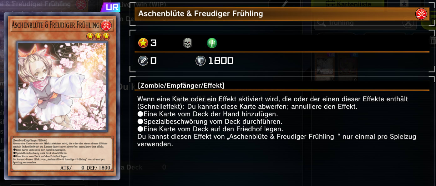 Prinzipiell kann man sich merken: Wird ein Effekt aktiviert, der eine Karte vom Deck an eine andere Position bewegen würde (das beinhaltet auch das Ziehen einer Karte), kann dieser mit Aschenblüte negiert werden. Kurioserweise kann auch der Effekt einer Karte negiert werden, die gerade keine Karte zieht, aber das potenzial hätte dies über einen zweiten Effekt zu tun.