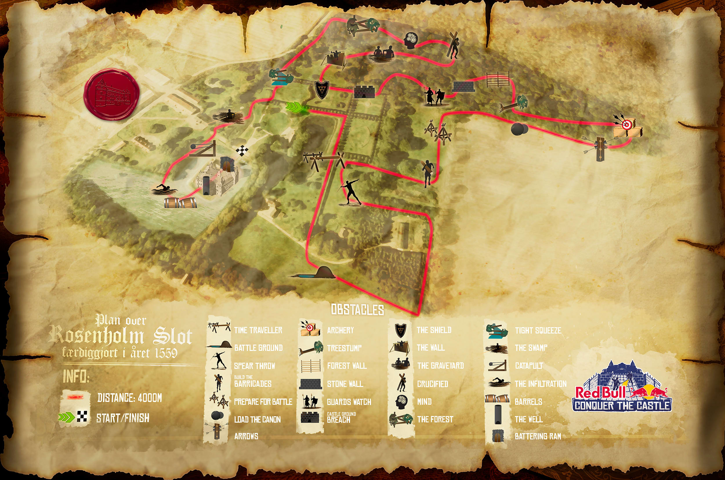 I rollen som renæssancekriger kan du opleve følelsen af at erobre det ikoniske Rosenholm Slot. På den 4000 meter lange rute skal du nedbryde og forcere slottets forsvarsmekanismer bestående af 26 forhindringer, inden du kan kalde dig for en ægte erobrer.