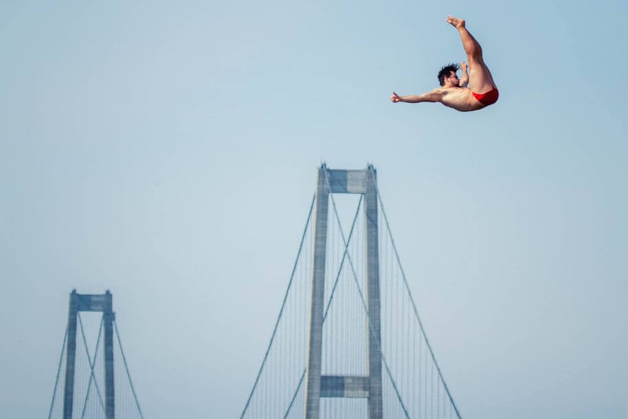 22-årige Jonas Madsen har dyrket udspring, siden han var helt lille, og han er ligesom Annika tredobbelt danmarksmester i highdiving. Faktisk sidder han så ondt på tronen, at det må tage pusten fra de fleste andre highdivere i Danmark. Han er nemlig forsvarende danmarksmester i samtlige fire udspringsdiscipliner - 1-meter, 3-meter, Tårn (5- 7,5- eller 10-meter) og highdiving.