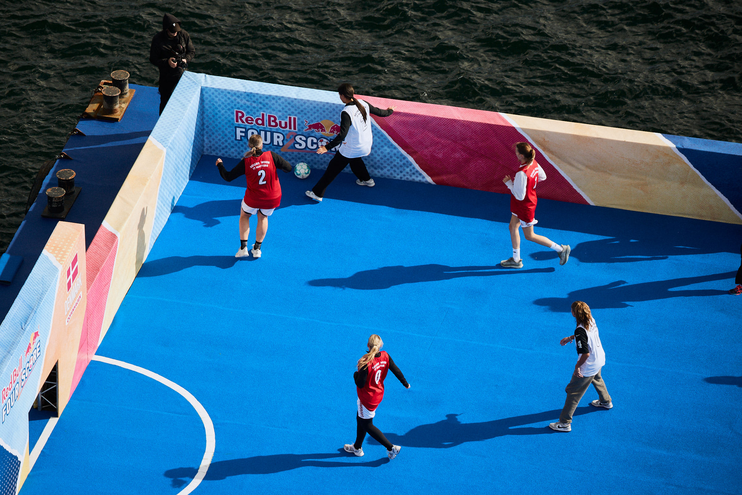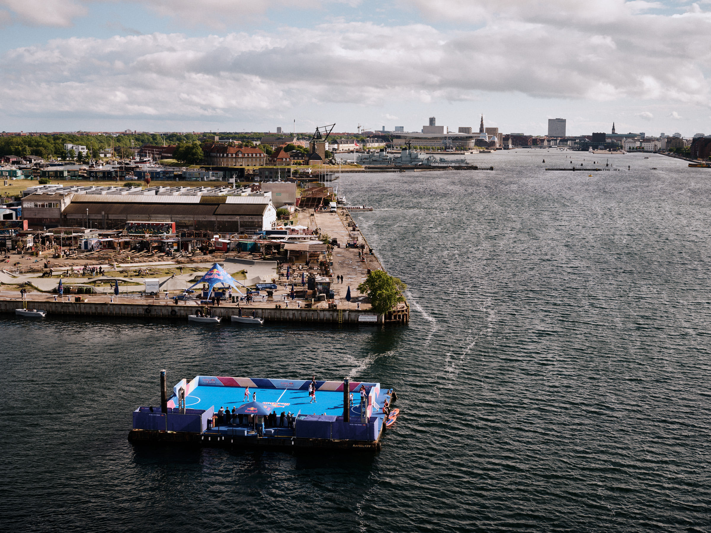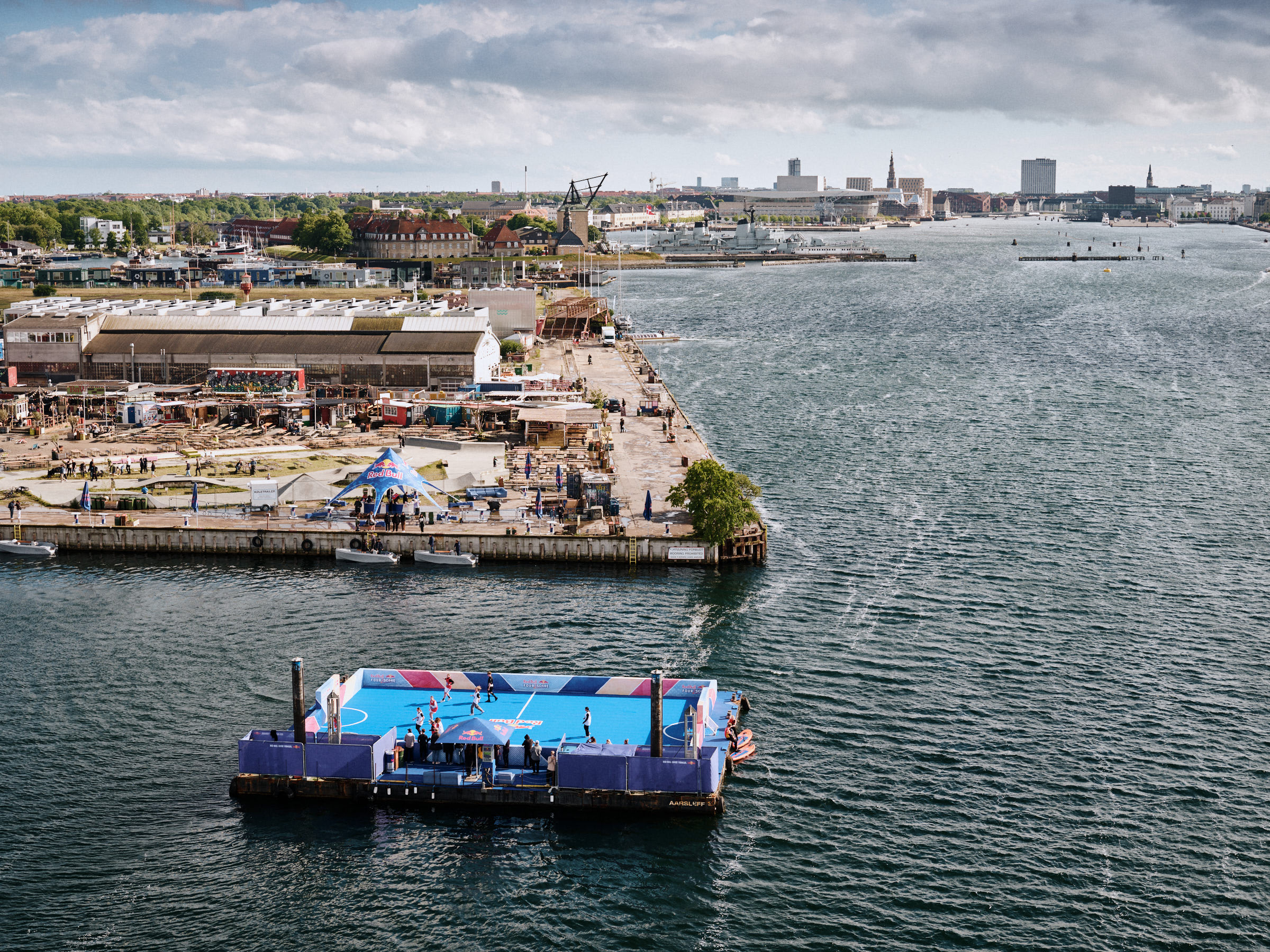 Se billederne fra fodboldfesten ud fra Reffen i København Red Bull Four 2 Score- flydende fodbold bane