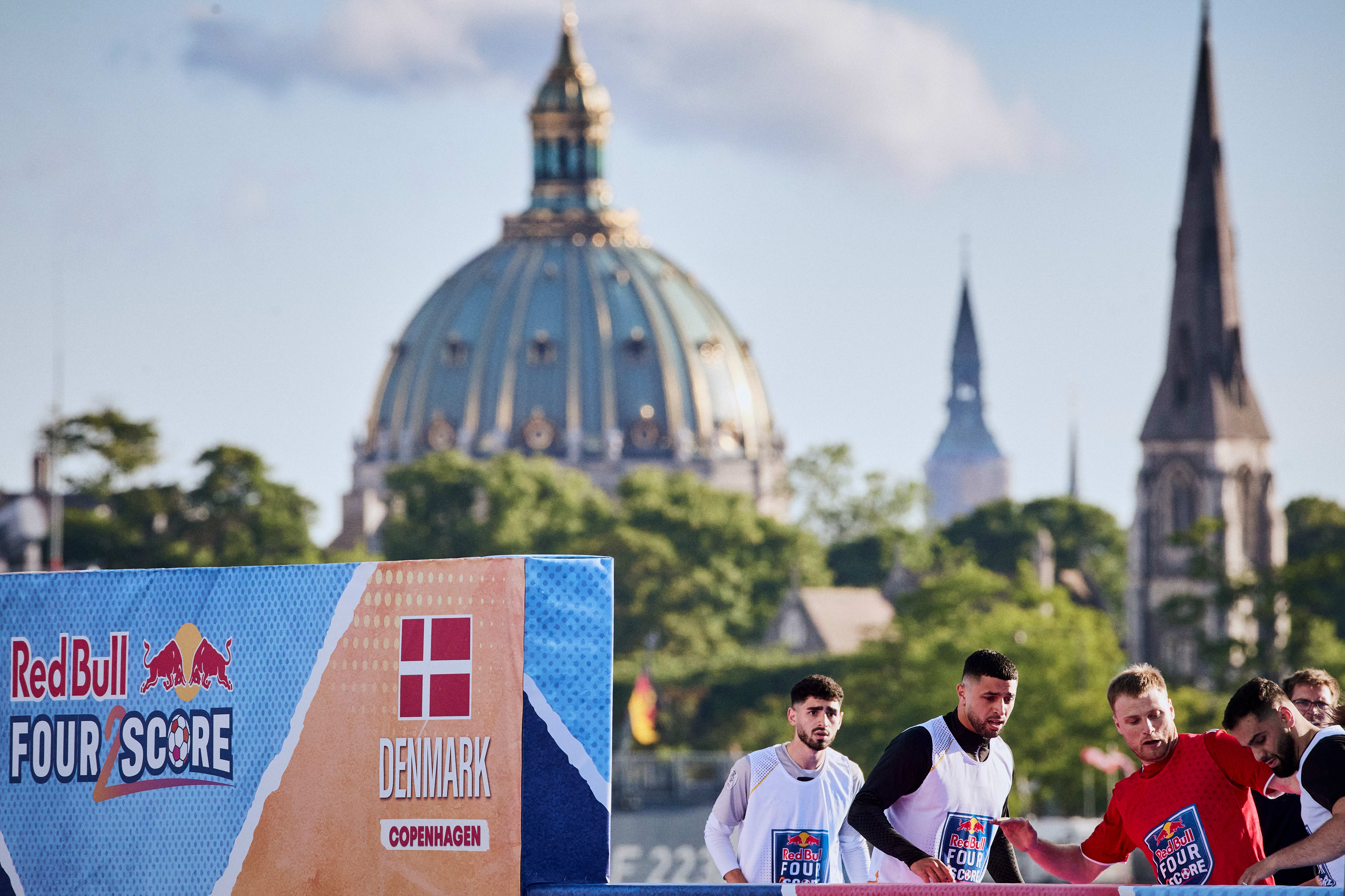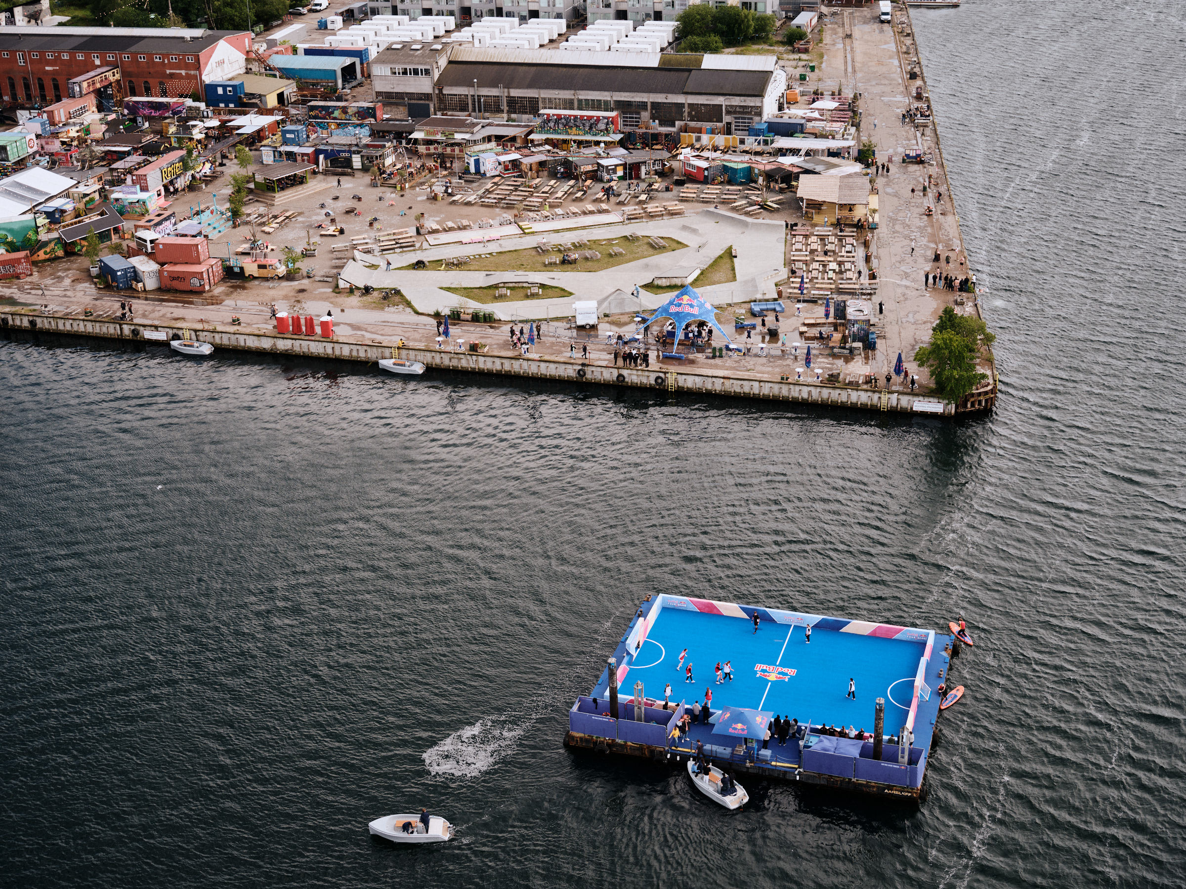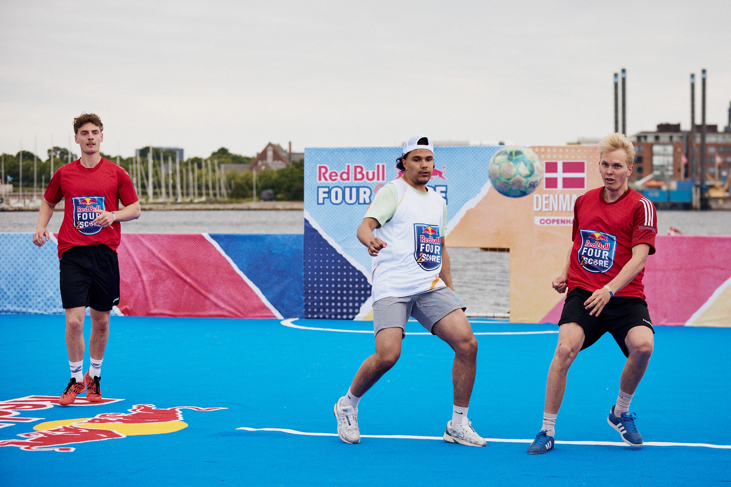 Se billederne fra fodboldfesten ud fra Reffen i København Red Bull Four 2 Score- flydende fodbold bane