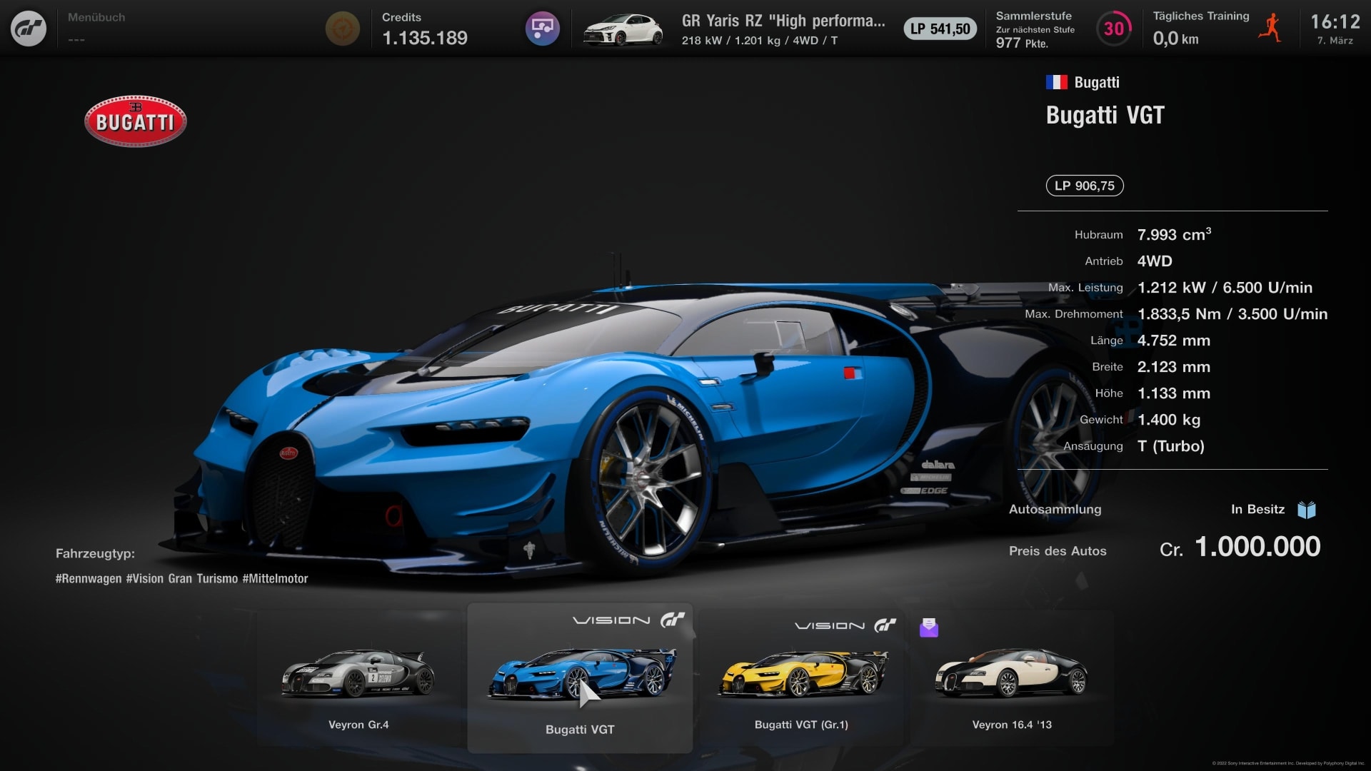 Bugatti Veyron, den 10. hurtigste bil i Gran Turismo 7, ligner en halt and sammenlignet med denne Vision GT-bil. VGT er trods alt 488 kg lettere end gadeversionen og har samtidig 477 kW ekstra styrke. For en million credits kan du erhverve den firehjulstrukne bil fra Bugatti-forhandleren i Brand Central.