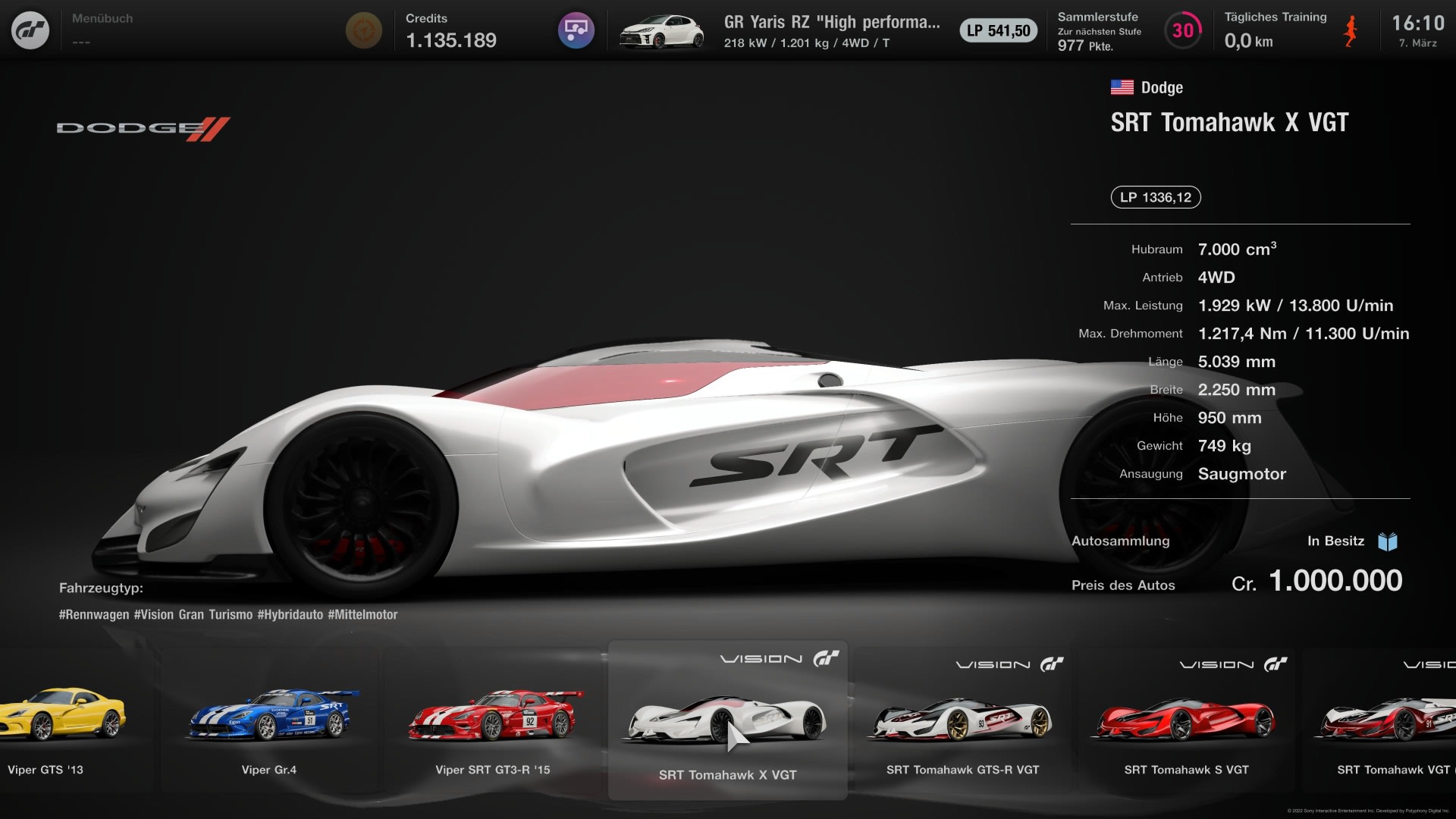 En anelse mere kraftfuld og akkurat lige så dyr er konceptbilen Dodge SRT Tomahawk S VGT fra Vision GT, som du kan købe i producentens Brand Central. LP-værdien på 916,17 afslører, at Dodge er væsentligt hurtigere end bilen på vores 9. plads. Dette sikres af den naturligt opsugede motor med en slagvolumen på 7.000 cm³ og den lave vægt på kun 921 kg.