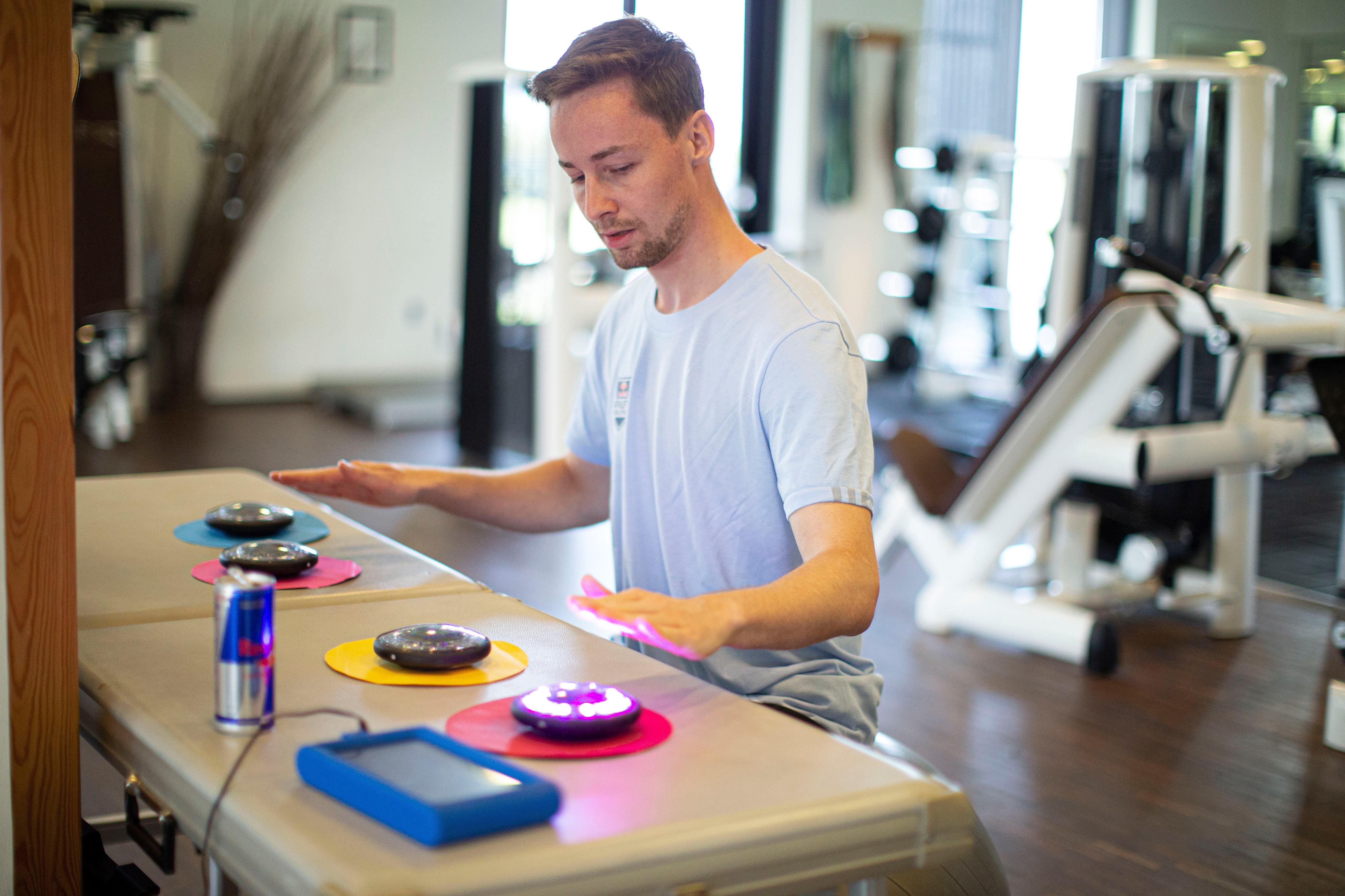 Fremgangsmåde: Du skal 'tappe' fire forskellige reaktionsknapper med hver deres farve. Når den gule knap lyser rødt, skal du tappe den gule knap og derefter den røde. Dette fortsætter i to minutter. Herefter måles din koncentrationsevne på antal fejl.