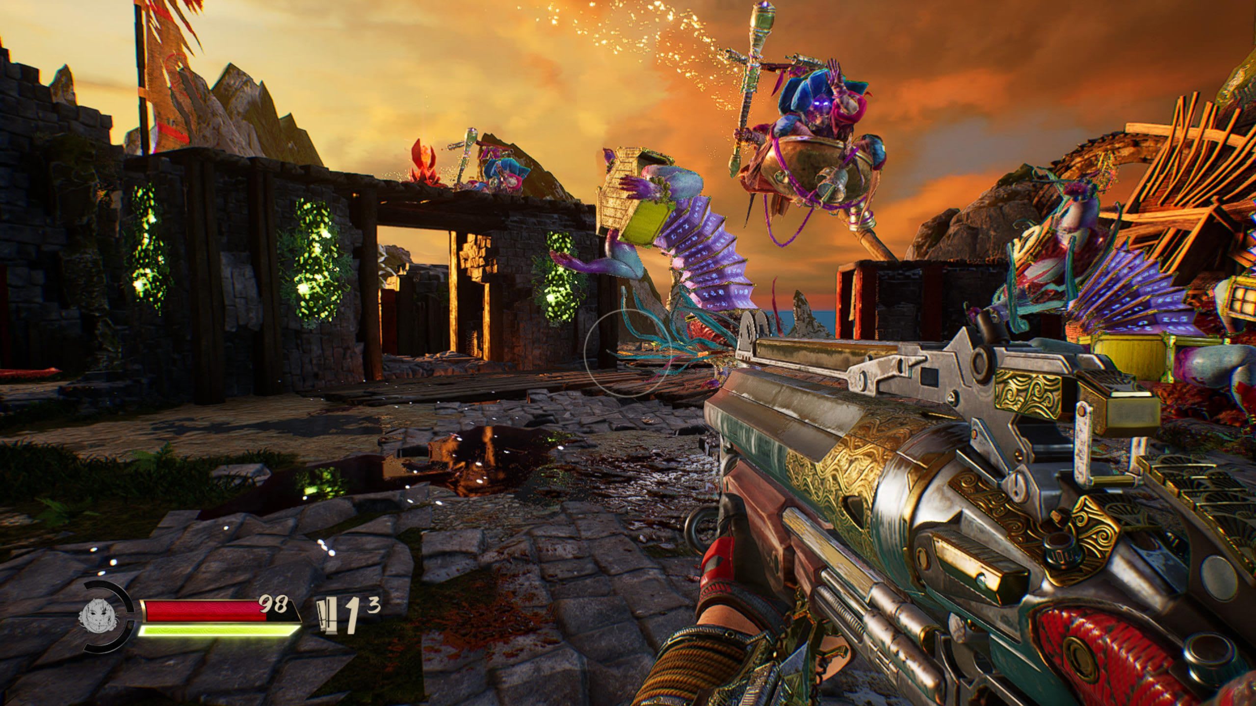 Cualquiera que haya jugado a los títulos de la serie Serious Sam, por ejemplo, sabe exactamente qué esperar y qué nivel de sinsentido le espera aquí. En cualquier caso, es difícil no sentirse como una superestrella absoluta mientras te abres paso a toda velocidad por los escenarios de inspiración japonesa.