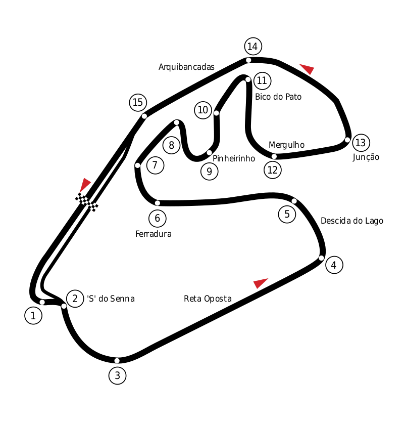 Rare tracé à tourner dans le sens inverse des aiguilles d’une montre (avec l'Autodromo Enzo e Dino Ferrari (Imola), le circuit international de Corée, le circuit Yas Marina, le circuit des Amériques, l'Otodrom Istanbul Park et le circuit urbain de Singapour) l’Autodromo José Carlos Pace est réputé pour être particulièrement vallonné et sinueux. Une première particularité que les pilotes découvrent dès le début de la course puisque la grille des stands est en montée.