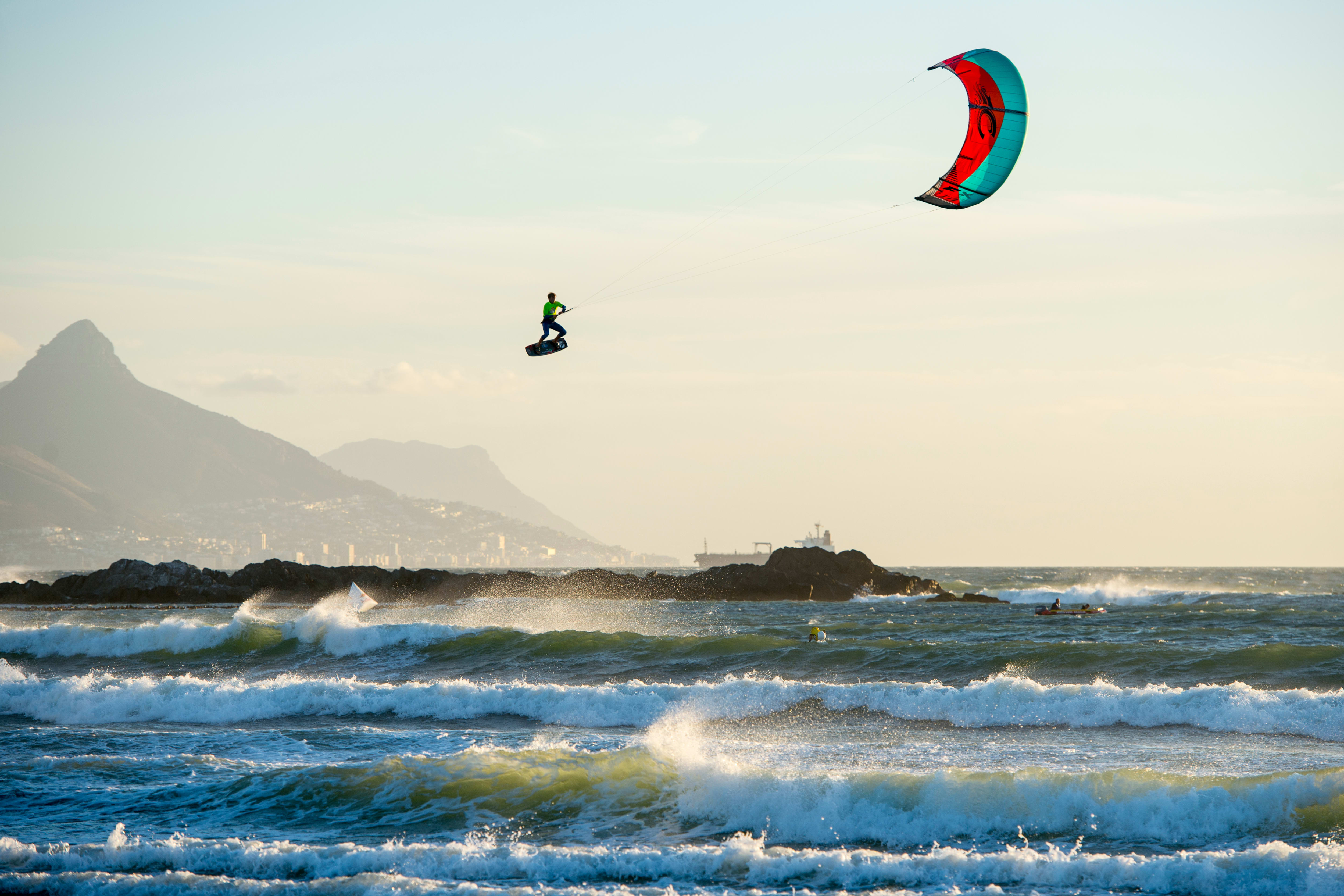 Kiteboarder lors du Red Bull King of the Air en Afrique du Sud, sur la plage de Cape Town.