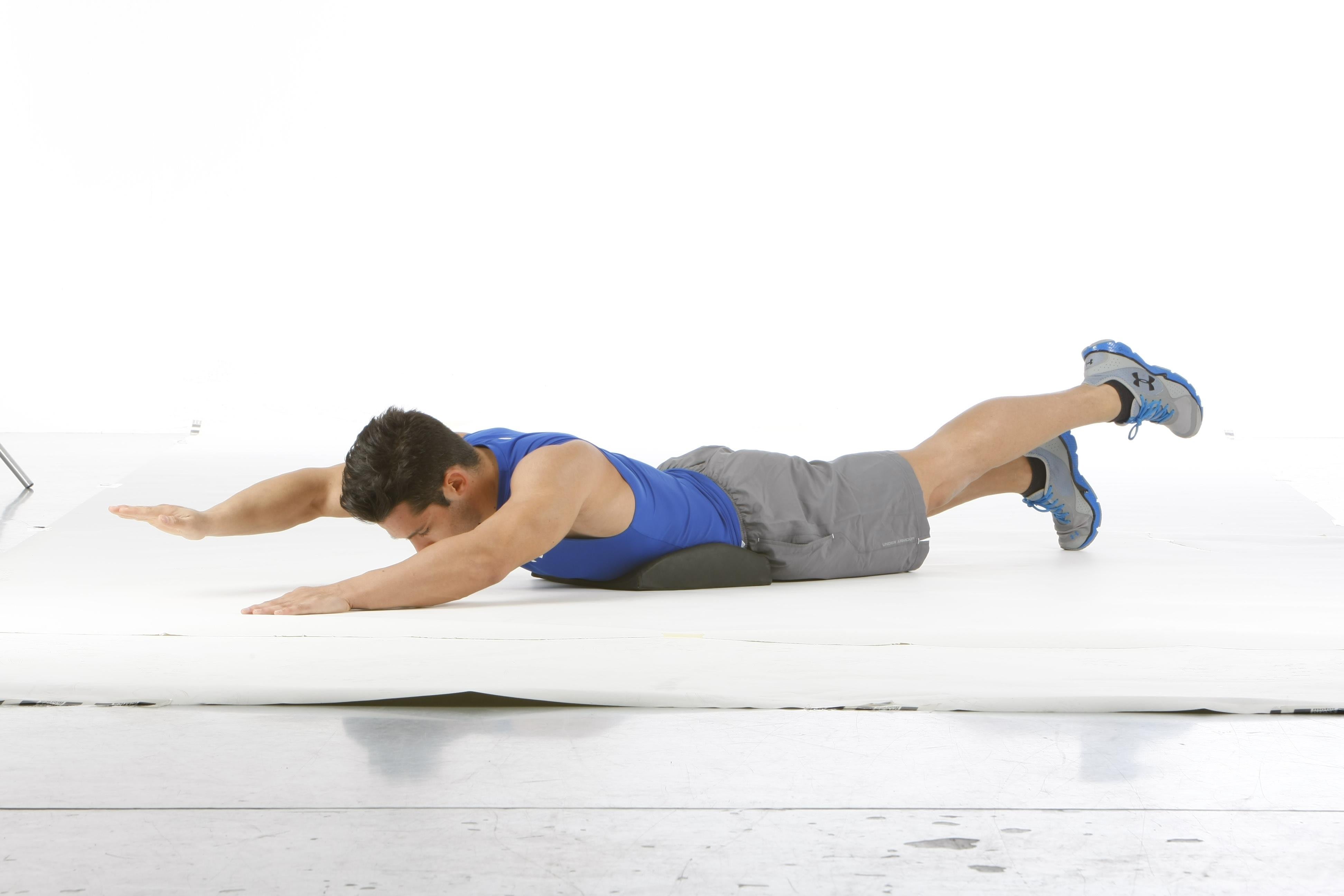 “Túmbate boca abajo y levanta a la vez brazo y pierna contrario. Trata de hacer 3 series de 8-10 repeticiones con cada lado”. Para evitar la compresión excesiva de las carillas articulares posteriores coloca un elemento como el de la foto (valdría un cojín o similar).