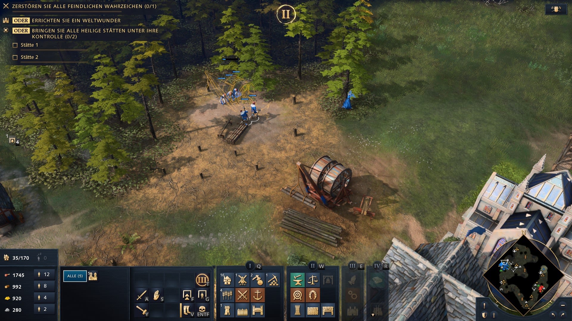 La madera es esencial para todas las construcciones, pero también necesitas mucha comida si quieres producir nuevas unidades todo el tiempo. El tercer recurso más importante es el oro y solo en último lugar está la piedra. En los primeros minutos del juego tienes que crear un montón de nuevos trabajadores para sentar una base sólida para tu economía y luego utilizar un par de ellos para la construcción de los primeros edificios. Empezar por las casas para aumentar la población.