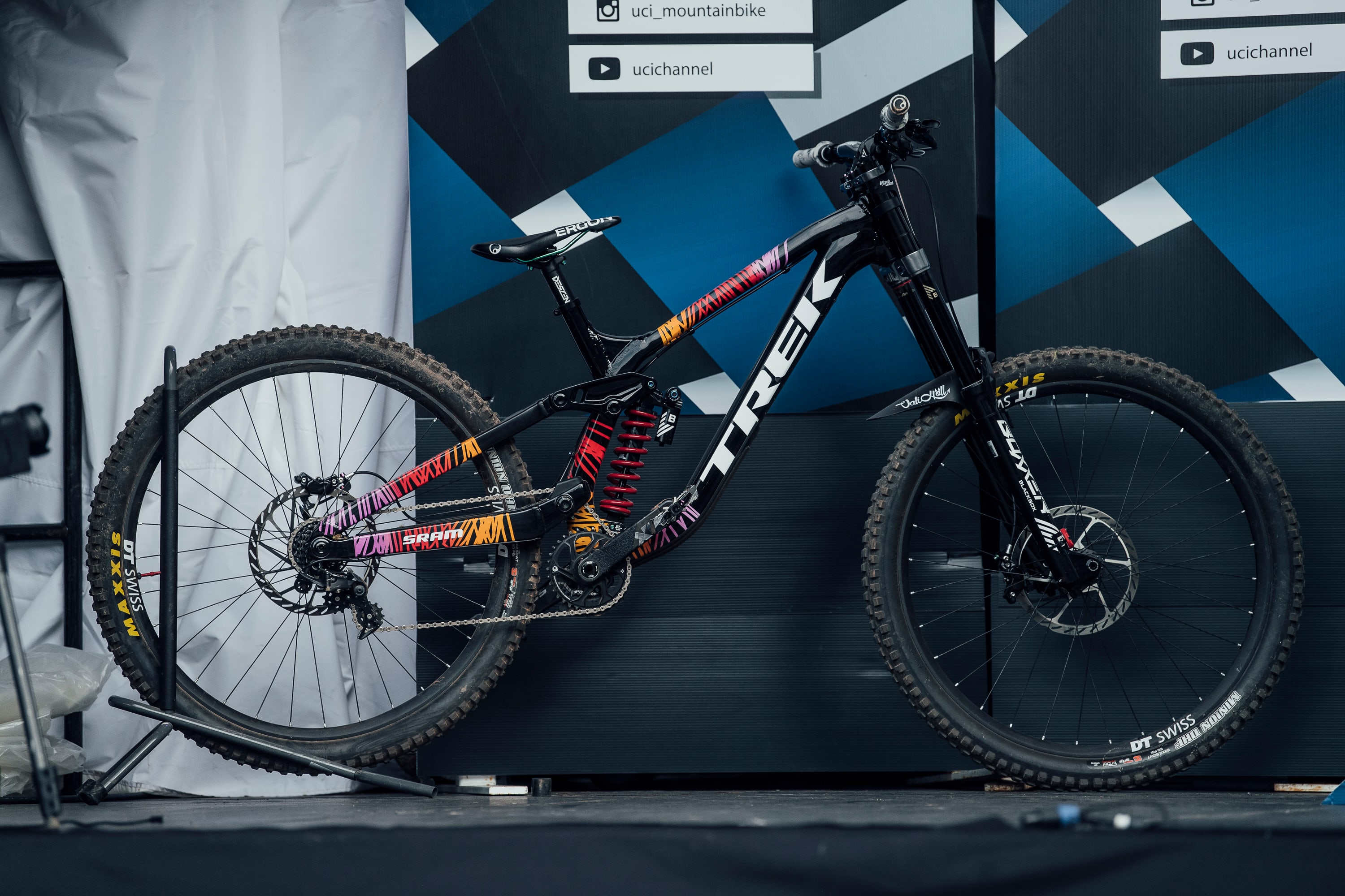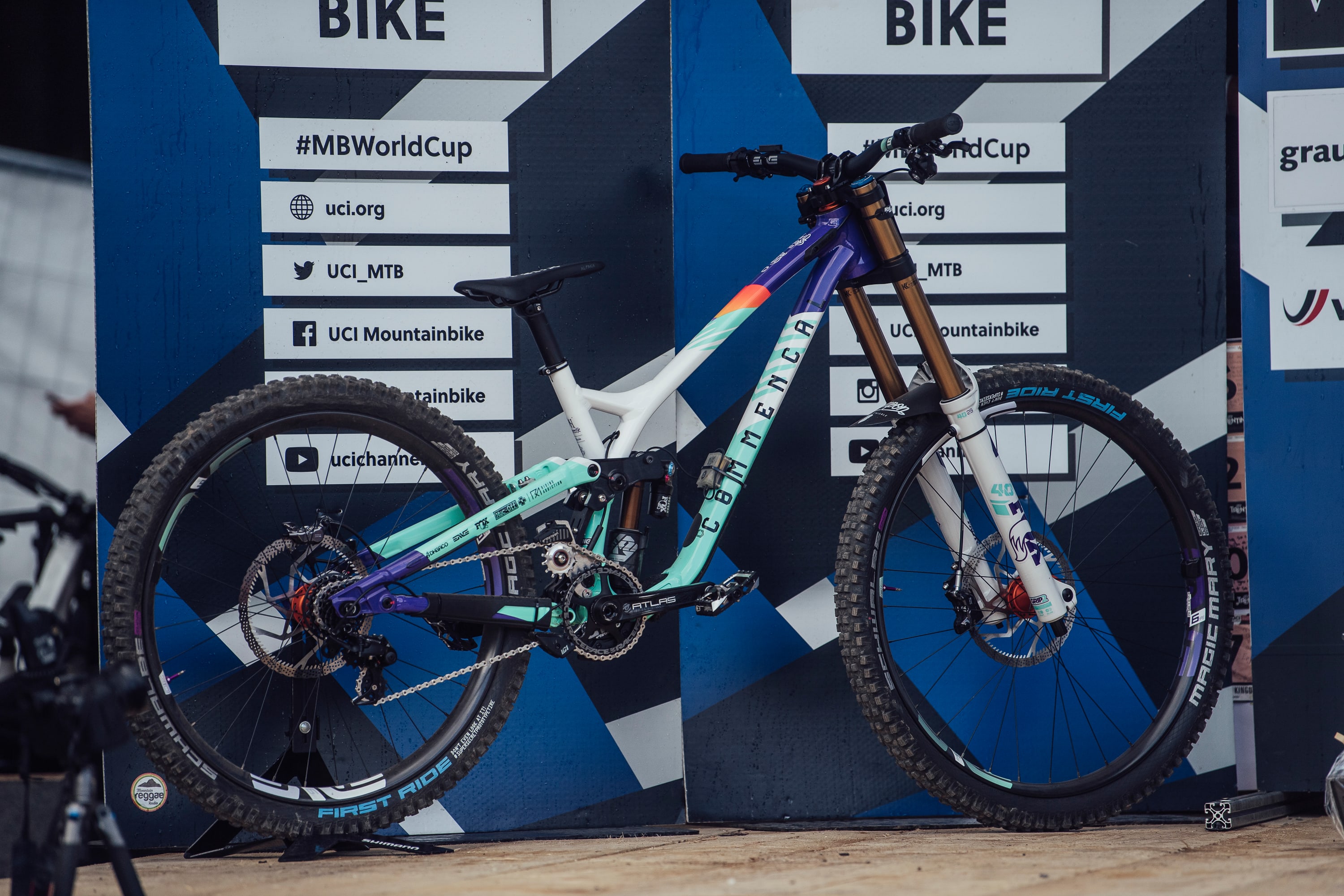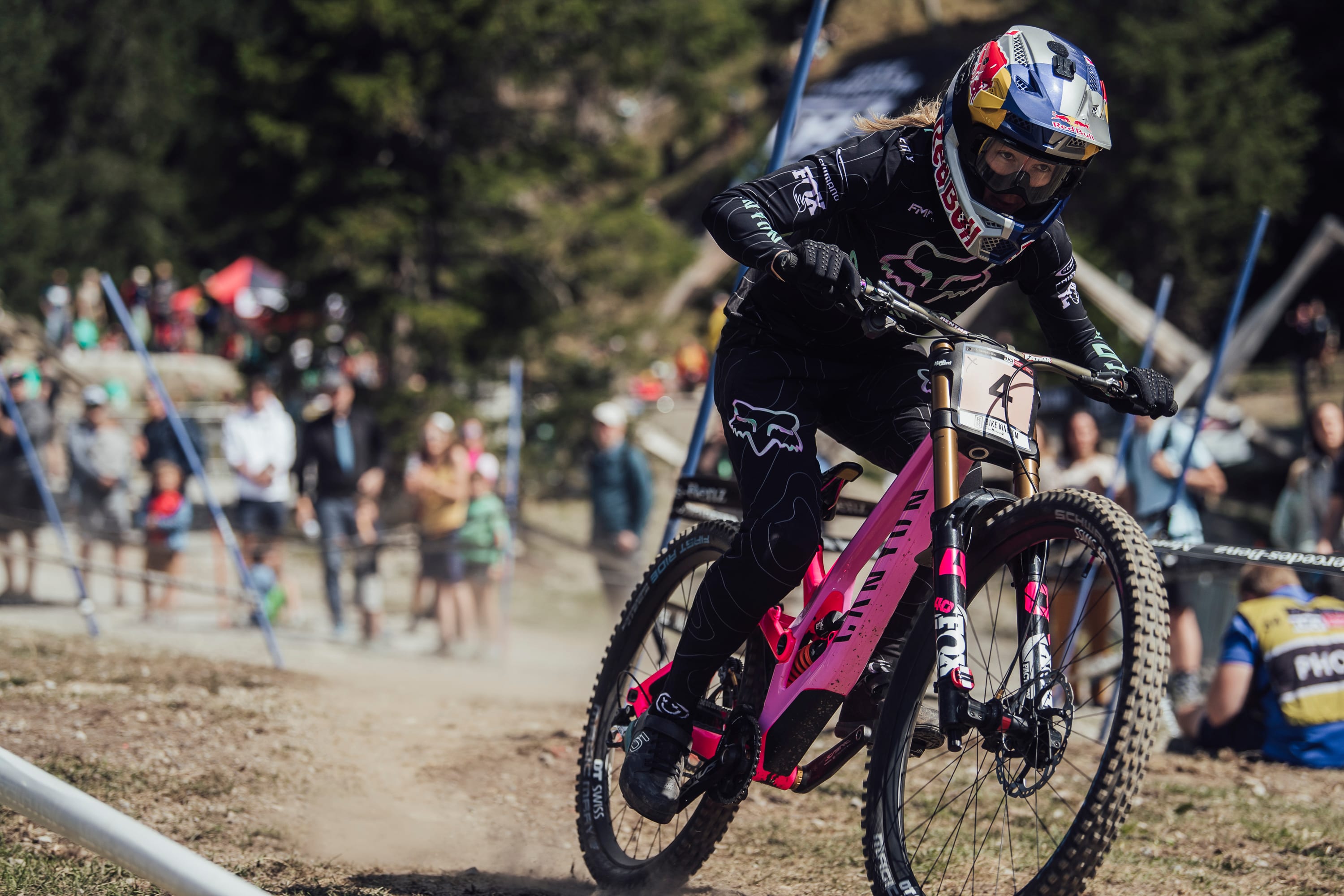Su modelo de World Champs presenta colores salvajes y partes a juego de colores en violeta, naranja y turquesa con un mensaje de "mantente salvaje" en su tubo superior. Claramente está funcionando para ella; no solo ganó los Campeonatos del Mundo en Val di Sole, sino que también la impulsó a la victoria en la Copa del Mundo en Maribor y Lenzerheide.