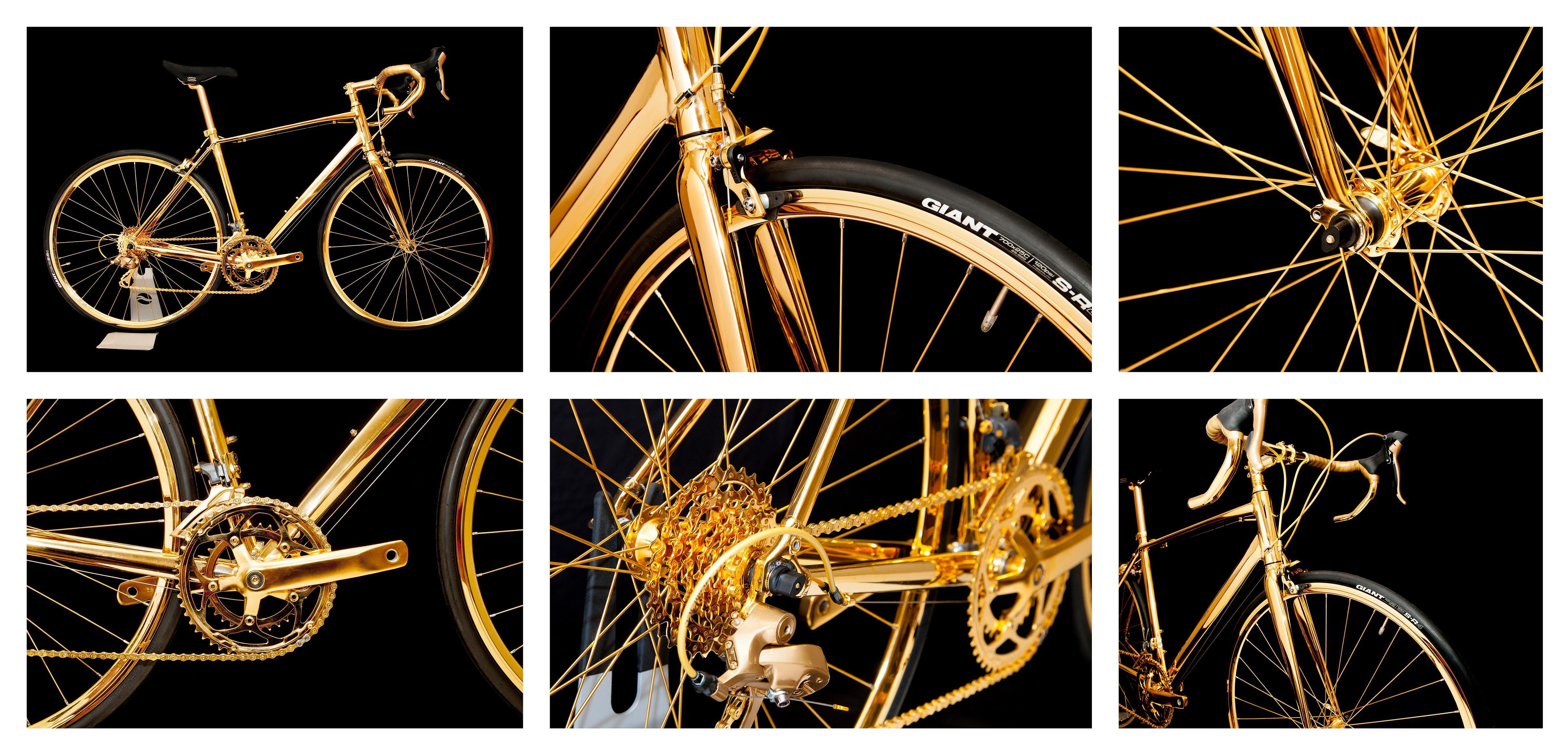 La fantástica bicicleta de carretera Goldgenie tiene completamente chapado de oro de 24 quilates todo lo que puedas imaginar, cadena, radios, frenos... La bicicleta que alcanza un precio de unos 350.000 euros sin duda un precio elevado para un artículo tan delicado. Goldgenie, se dedica por completo a la customización de todo tipo de artículos como smartphones, relojes y cualquier otra cosa que se esté dispuesta a pagar.