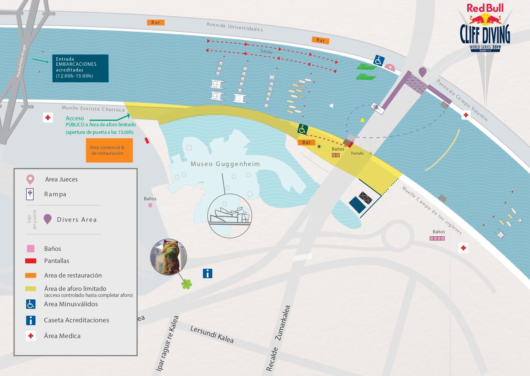 - Esta zona concreta será la única en donde habrá un espacio de aforo limitado. Al ser un área reducido, se acotará y se regulará el acceso a este espacio permitiendo la entrada únicamente desde una puerta ubicada en la explanada del Museo Guggenheim Bilbao (ver plano arriba). Se permitirá el acceso hasta completar aforo. La puerta se abrirá a las 15:00h.