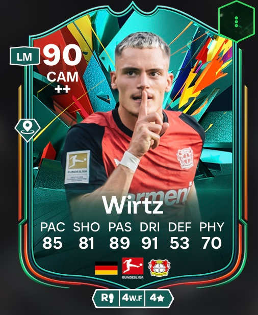 Empezaremos con la carta Florian Wirtz Total Rush, que juega increíblemente bien. 91 de regate, 89 de pase y 85 de velocidad son puntuaciones muy altas. Por cierto, Wirtz sigue jugando en todas las competiciones con el Bayer 04 Leverkusen en la temporada 2024/25. En los octavos de final de la Copa DFB ganaron 1:0 al Bayern de Múnich a principios de diciembre.