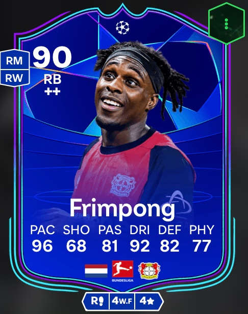 La siguiente tarjeta especial de la Bundesliga también es de una estrella del Bayer 04 Leverkusen. La versión UCL Road to the Knockouts de Jeremy Frimpong impresiona con 96 de velocidad y 92 de regate, entre otras cosas. Sus excelentes actuaciones en la Fase de Grupos de la Liga de Campeones ya han mejorado la puntuación global de la carta dinámica de 88 a 90. Recibirá una nueva mejora si termina la Fase de Grupos de la Liga de Campeones entre los 2 mejores equipos con el Bayer Leverkusen.