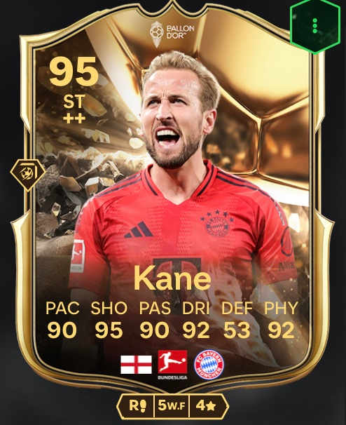 Aún mejor es su carta dinámica UCL Road to the Knockouts, que actualmente tiene una puntuación global de 93. Pero esta no es todavía la mejor carta especial de Kane. La tarjeta UCL es superada por la versión Ballon d'or. Con una puntuación total de 95 y los mejores valores, como 92 en regate, 92 en físico y 90 en velocidad, esta tarjeta es, con diferencia, la mejor de la Bundesliga.
