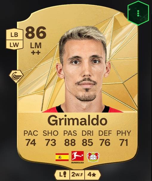 Alejandro Grimaldo también está entre los 7 mejores. El español se ha convertido en uno de los mejores laterales izquierdos del mundo en la temporada de campeonato del Bayer 04 Leverkusen y tiene una valoración global de 86 en FC 25. Puntuaciones como 88 en pases y 85 en regates aseguran que Grimaldo también impresiona en el campo virtual.