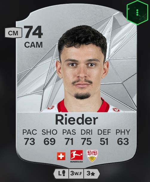 Puede que el internacional suizo ya no sea un desconocido, pero sigue siendo un jugador con mucho potencial en el modo Carrera de FC 25. Rieder, de 22 años, todavía puede mejorar su valoración general en ocho puntos. Su alta porcentaje inicial de 74 tiene la ventaja de que puede reforzar tu club desde el principio.