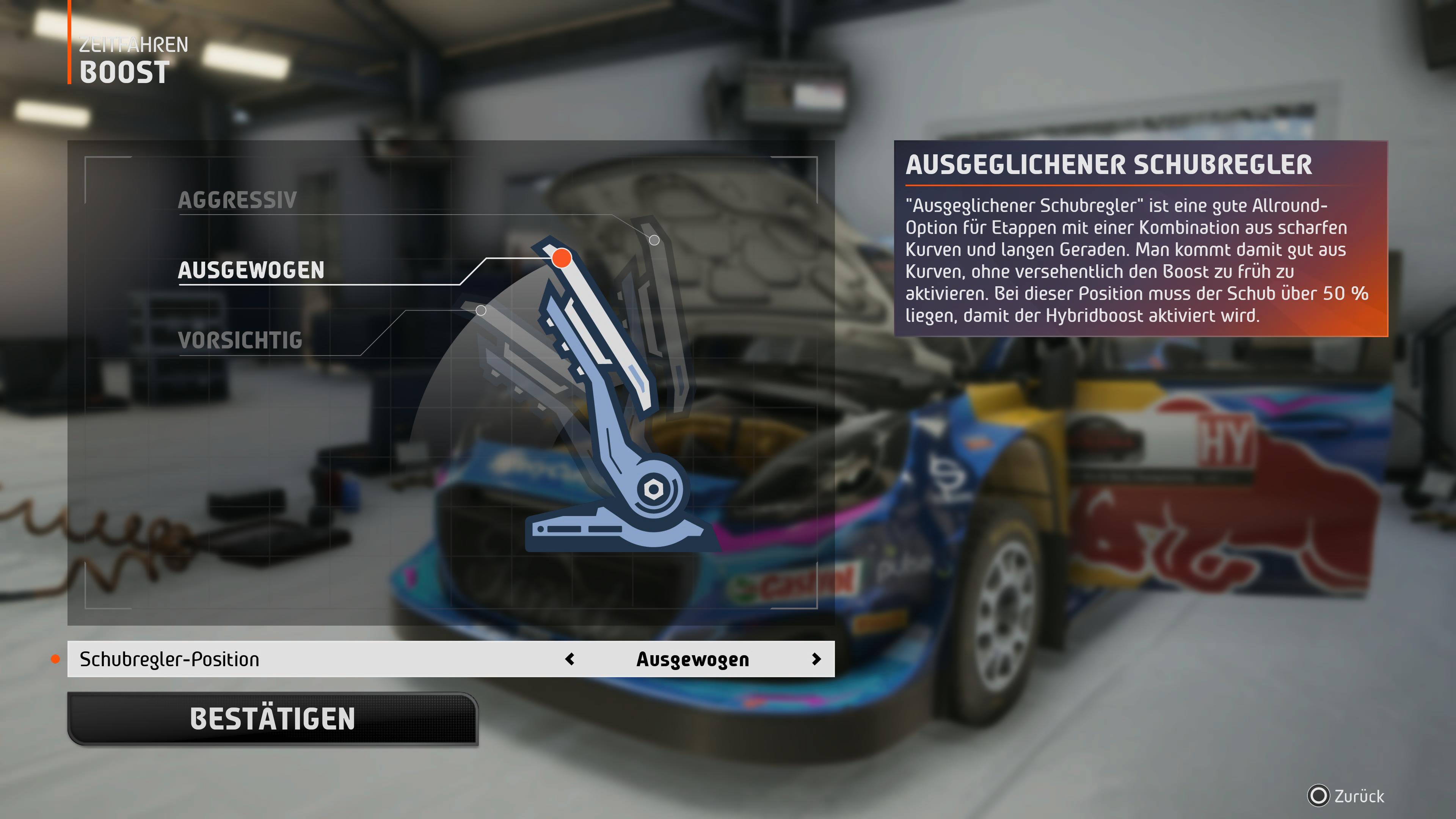 Desde la temporada 2022, los coches de la categoría reina del WRC utilizan propulsión híbrida. Aunque no puedes regular de forma independiente los caballos de potencia adicionales del motor eléctrico, sí tienes la opción de influir en la entrega de potencia en los ajustes de sobrealimentación antes de una etapa.