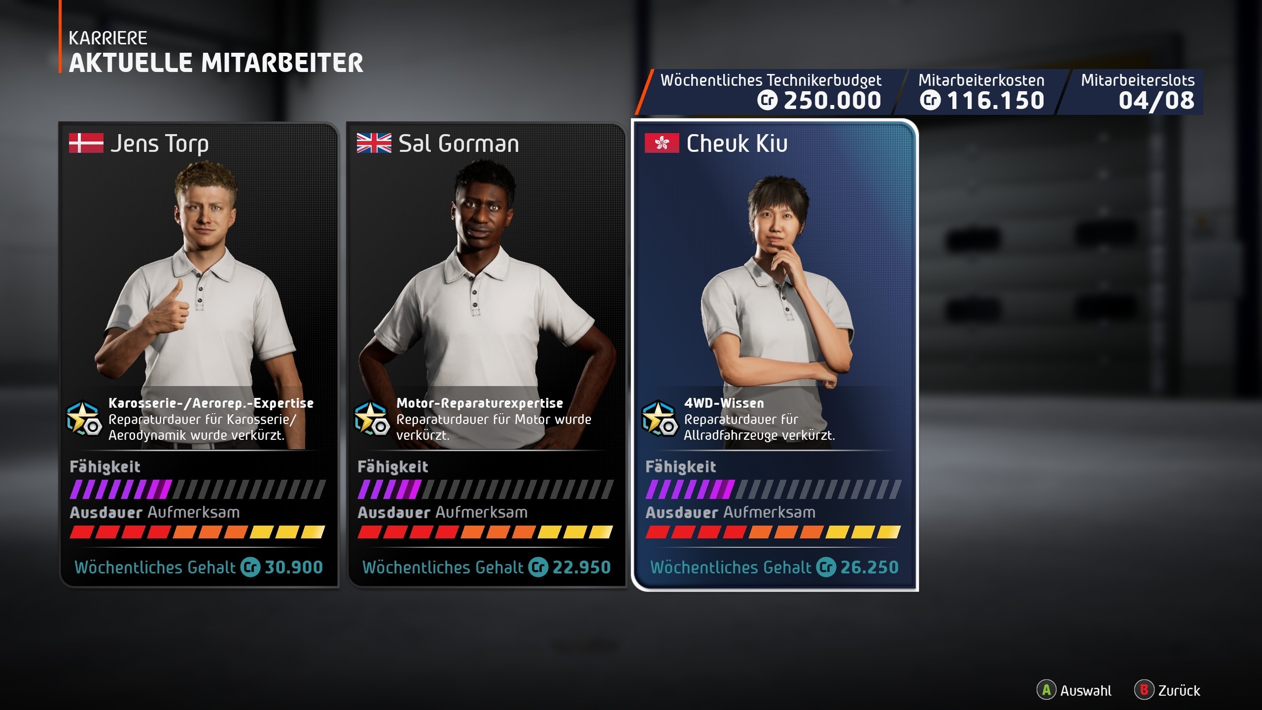 También puedes equipar a tus técnicos jefe con nuevas habilidades en un extenso árbol de talentos. Hay siete categorías entre las que elegir, cada una con nueve habilidades que se pueden desbloquear. Estos talentos pueden reducir los costes de reparación de diversos componentes o aumentar la eficacia de otros miembros del equipo.