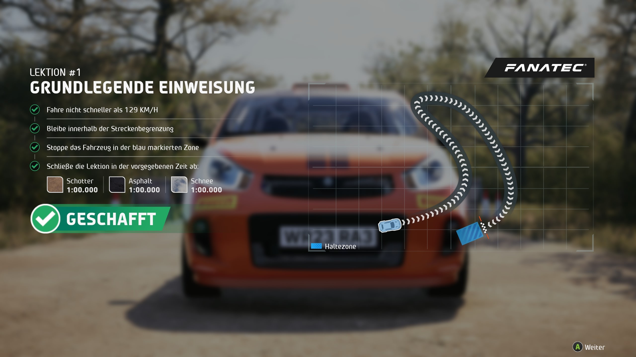 Aprenderás cómo mantenerte en la pista, cómo derrapar correctamente y de qué tratan los distintos avisos del copiloto. Las pruebas están disponibles para tres superficies de carretera diferentes: Grava, asfalto y nieve.