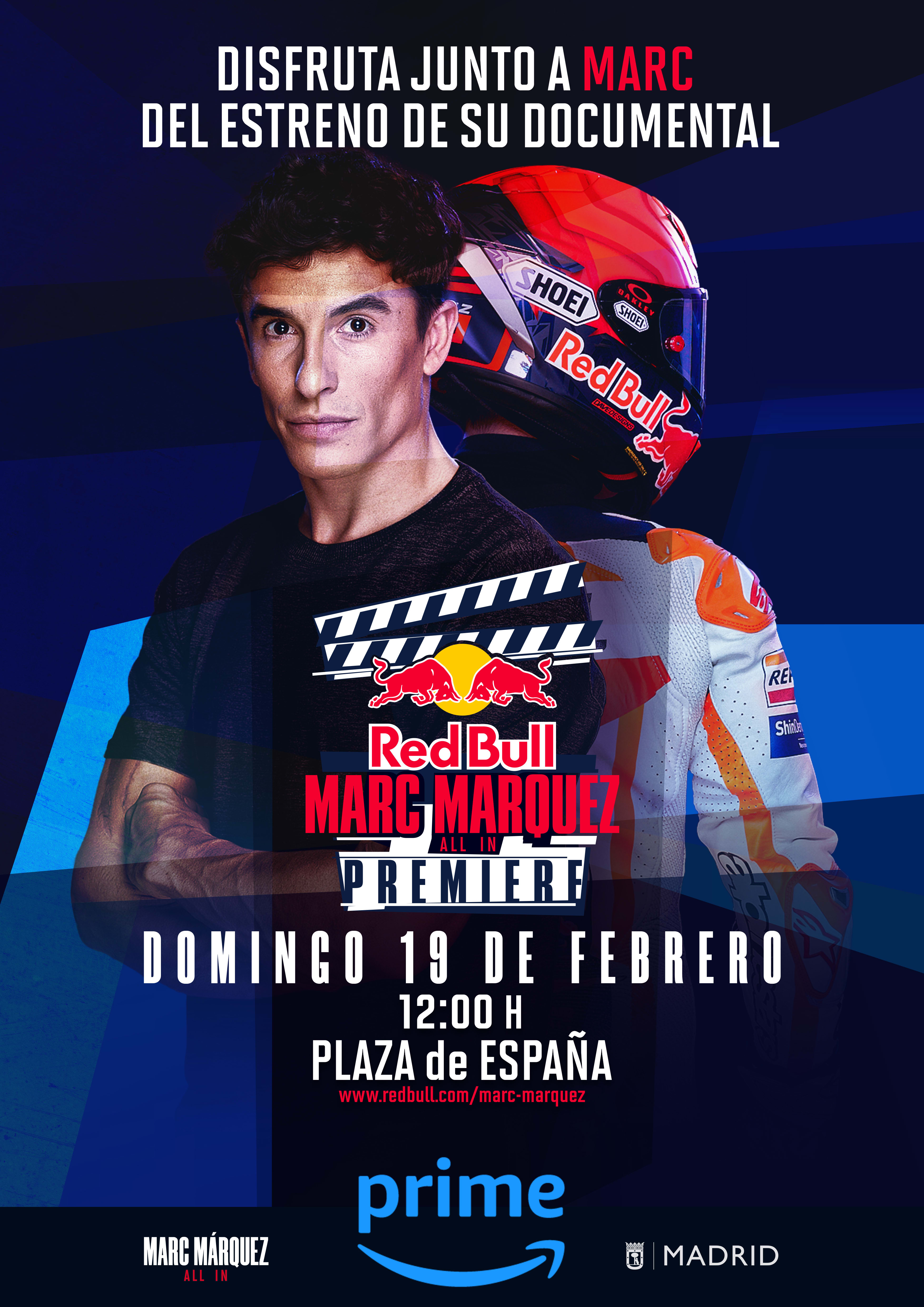 A partir de las 12:30, en la madrileña Plaza de España podrás ver el pase de preestreno del primer episodio de la docuserie Marc Márquez All In. Es un documental que nos cuenta la trayectoria del piloto de MotoGP durante los últimos años, desde la caída y lesión de 2019 hasta este momento. Su vuelta a los circuitos ya físicamente recuperado y con energías y fuerzas renovadas. Es una coproducción entre Prime Video, Dorna y Red Bull.