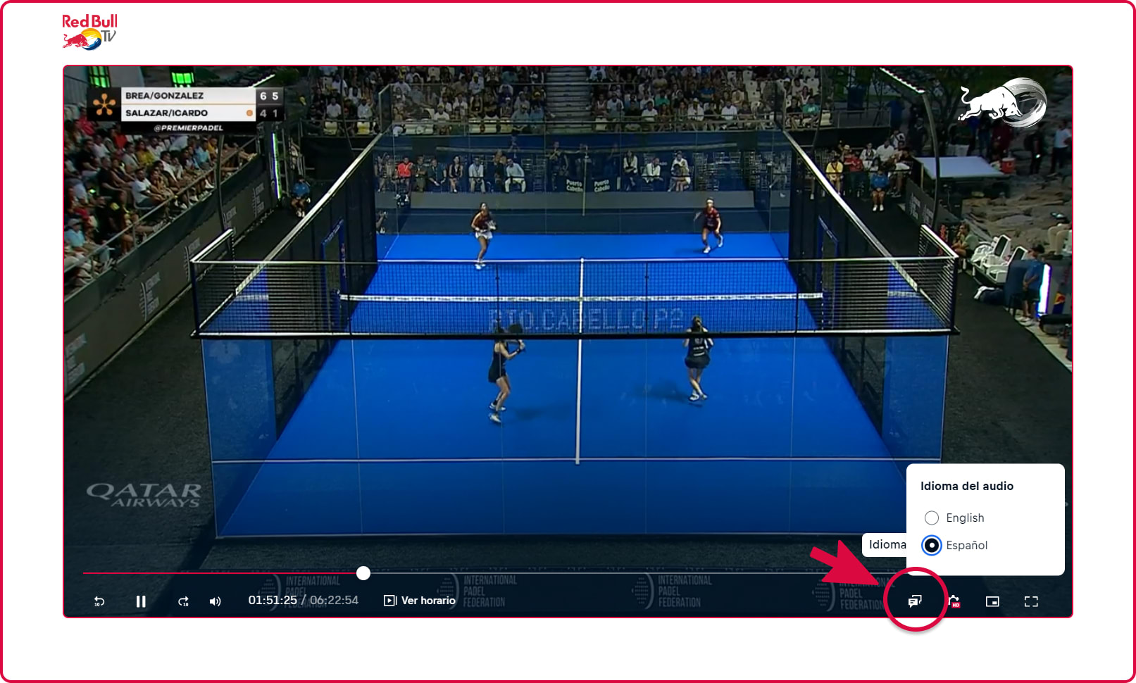 Todos los partidos de Premier Padel podrán seguirse en español a través del streaming de Red Bull TV que contará con comentaristas de lujo como Sebas Nerone, Jorge Martínez, Bárbara Vitantonio, Alberto Bote, David de Gustín, Irene Gómez o Mati Díaz. El streaming en español está geolocalizado para todas las conexiones desde España. Aun así, podrá seleccionarse manualmente a través del propio reproductor del live (esquina inferior derecha).