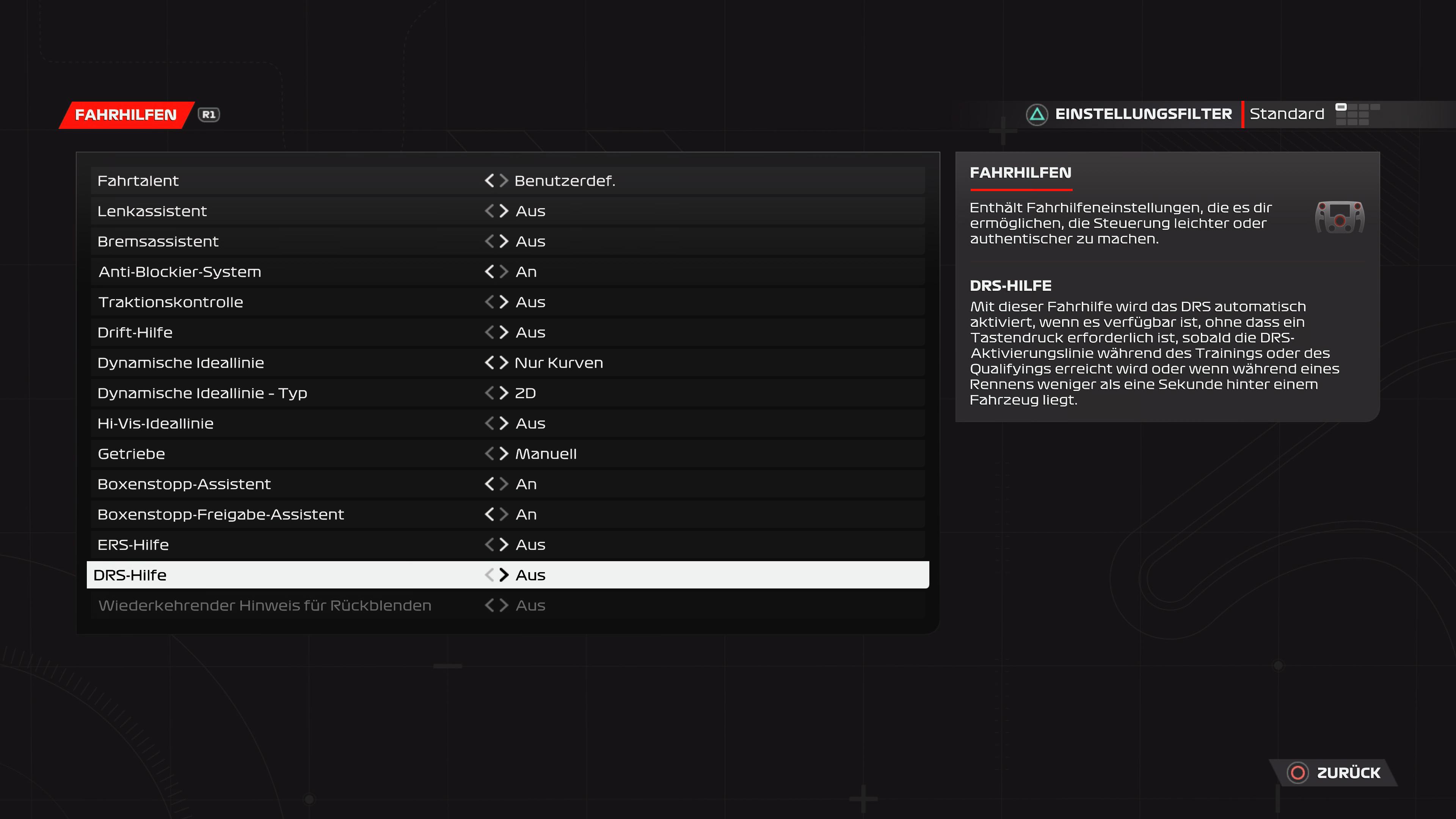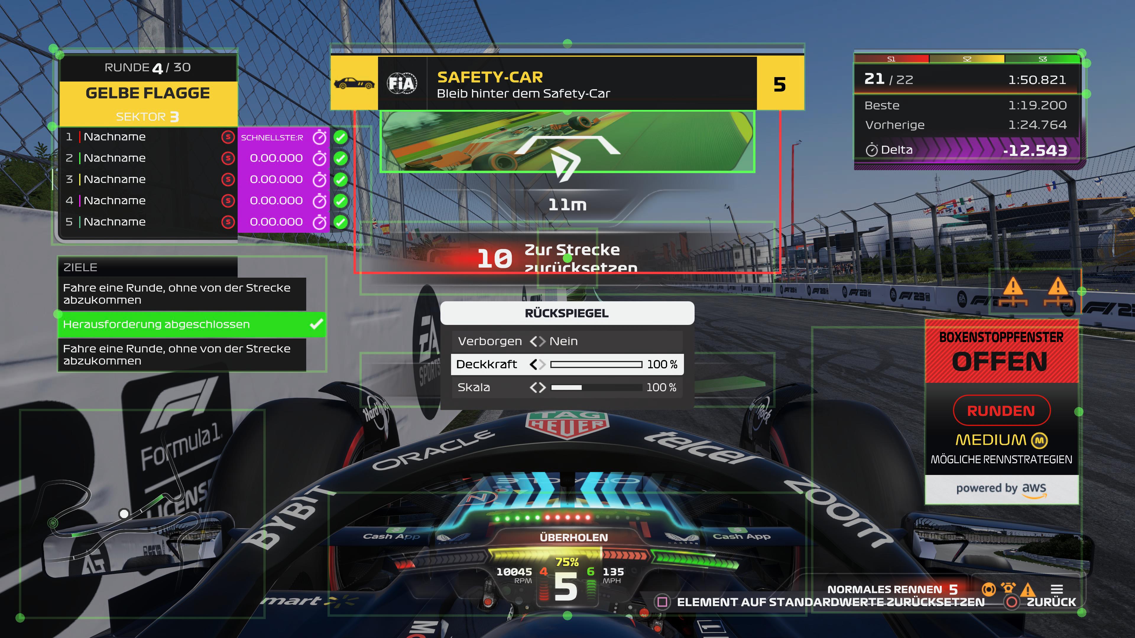La ayuda del ERS, por otro lado, debería desactivarse definitivamente, porque el uso automático de los caballos extra rara vez es realmente útil. Puedes ganar fácilmente 1 segundo en el tiempo por vuelta si utilizas el ERS de forma independiente.