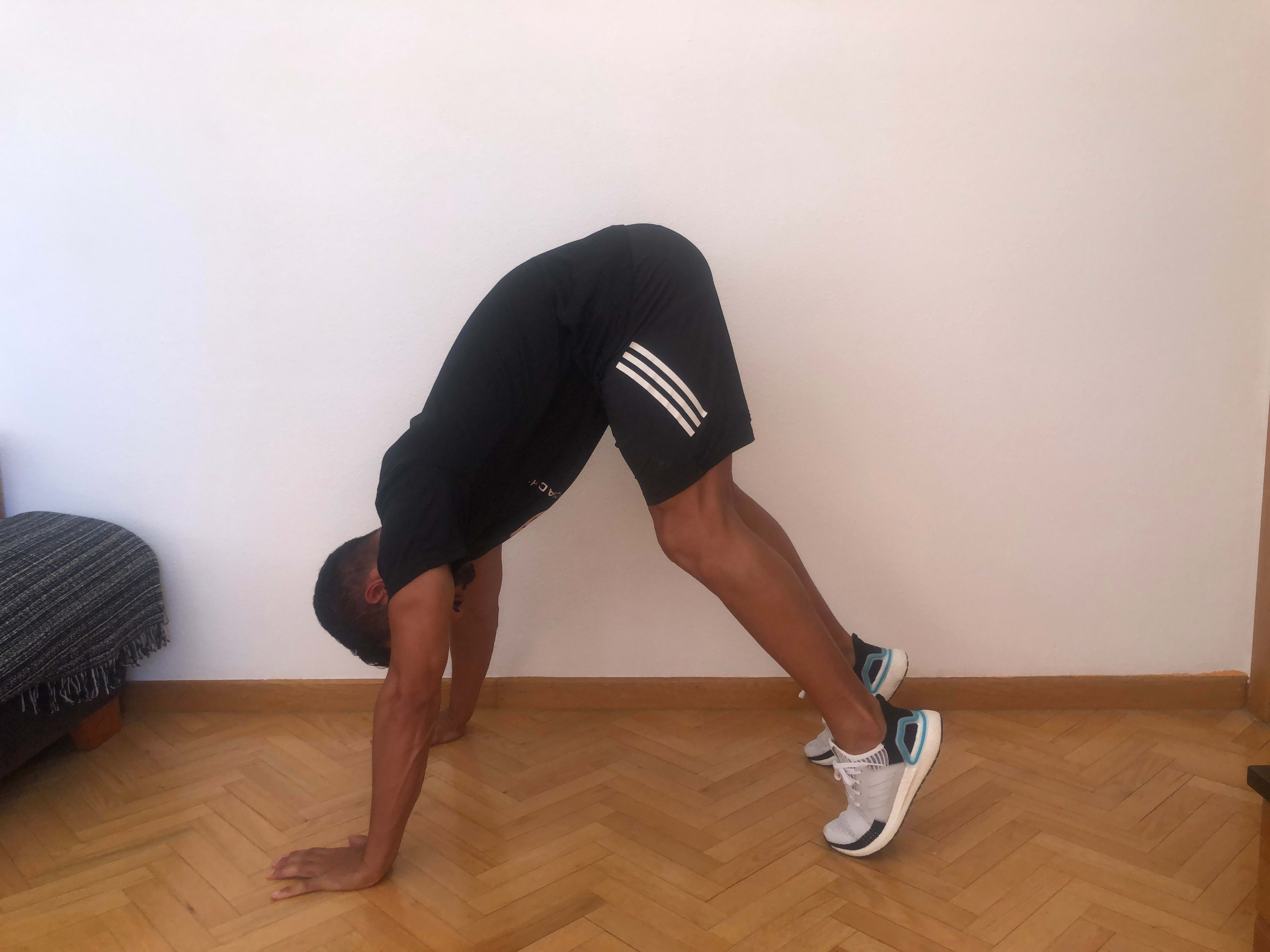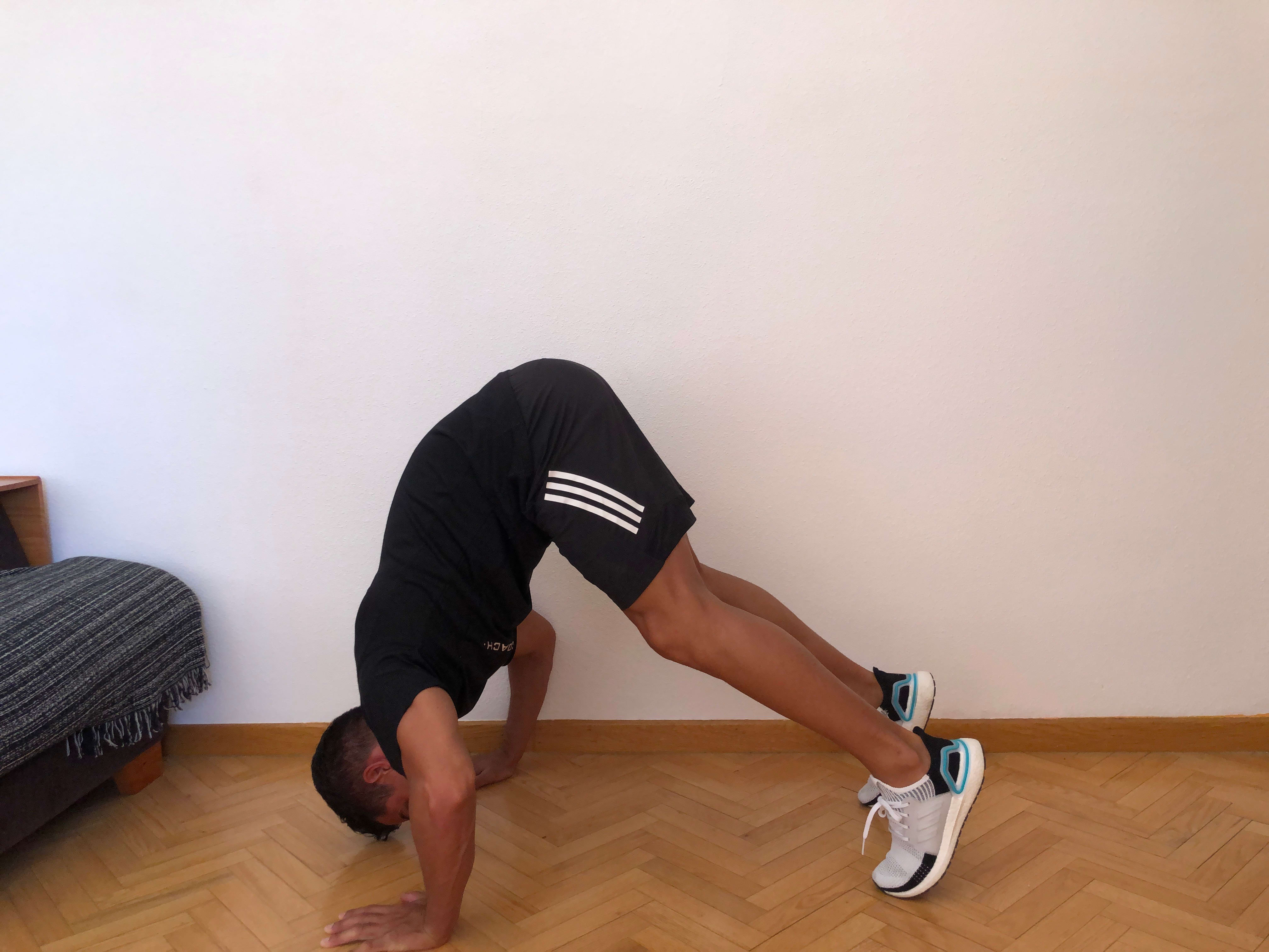 El más importante para ejercitar la parte frontal de los hombros es el ejercicio de empuje que realizamos frecuentemente (flexiones), pero en este caso con una ligera elevación de cadera. Dibuja una pirámide con tu cuerpo y realiza una flexión de codos llevando la frente al suelo. Este ejercicio lo podemos hacer con nuestro propio peso corporal.