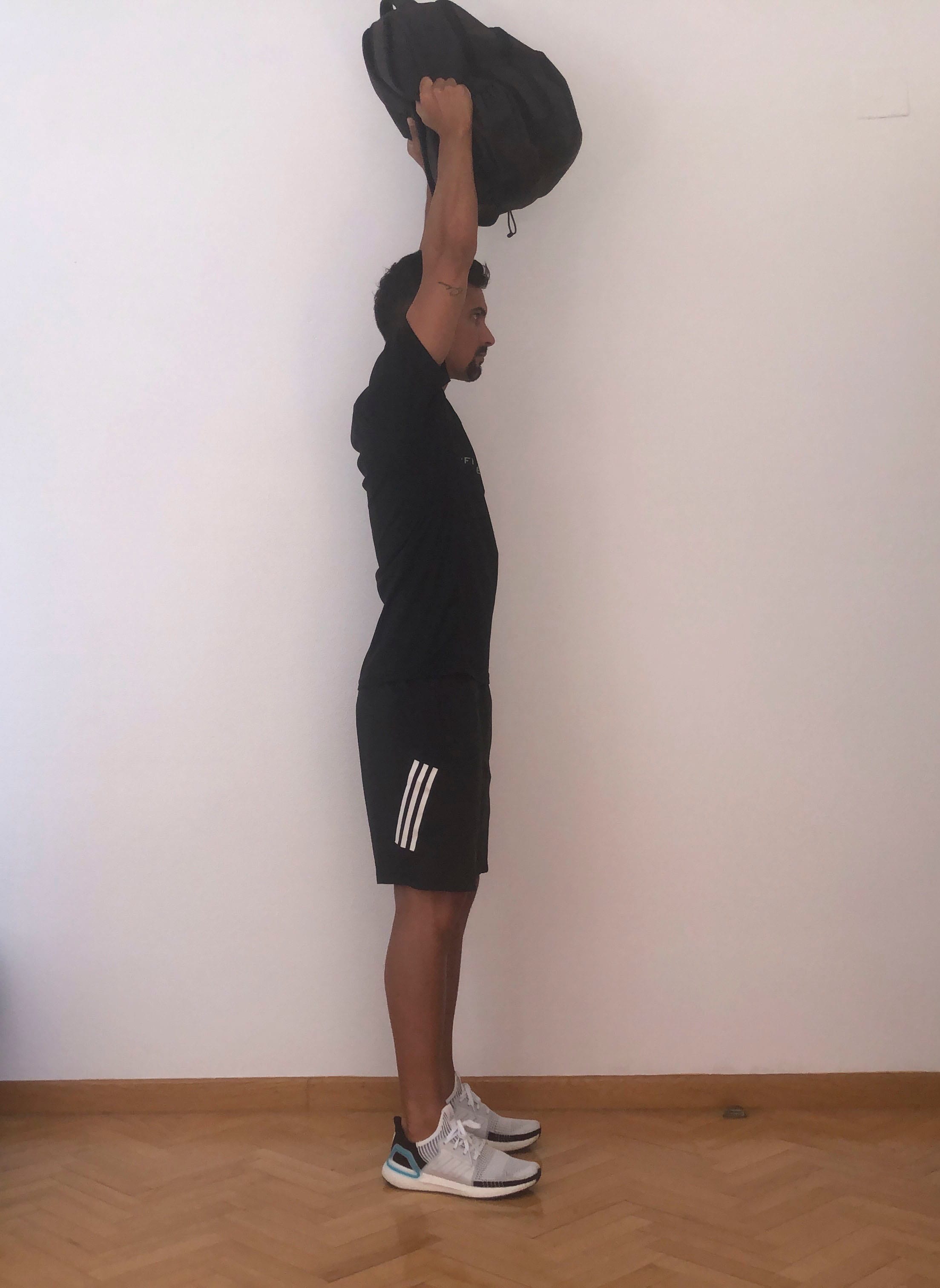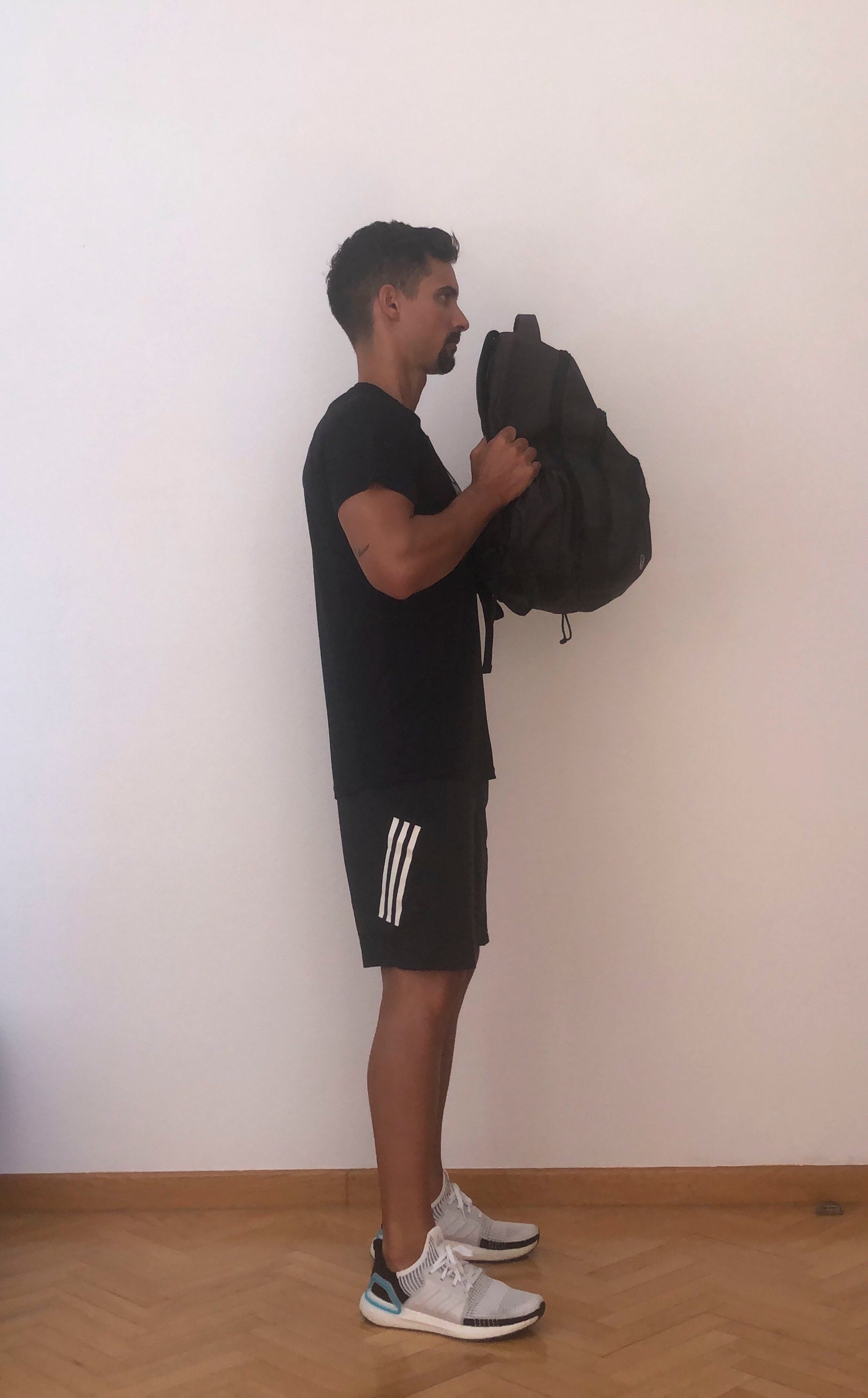 Para trabajar todo el hombro en su conjunto utilizaremos una mochila llena de peso. El ejercicio que vamos a elegir es el press militar, ya que realizándolo con la correcta técnica es uno de los ejercicios estrella en el trabajo de esta musculatura. Este ejercicio lo puedes realizar de pie o sentado, pero lo más importante es que la mochila tenga el peso suficiente para crear un estímulo en tus músculos y poder realizar tres series de 12 a 15 repeticiones (las mismas aconsejadas para los dos anteriores ejercicios) con cierta dificultad.