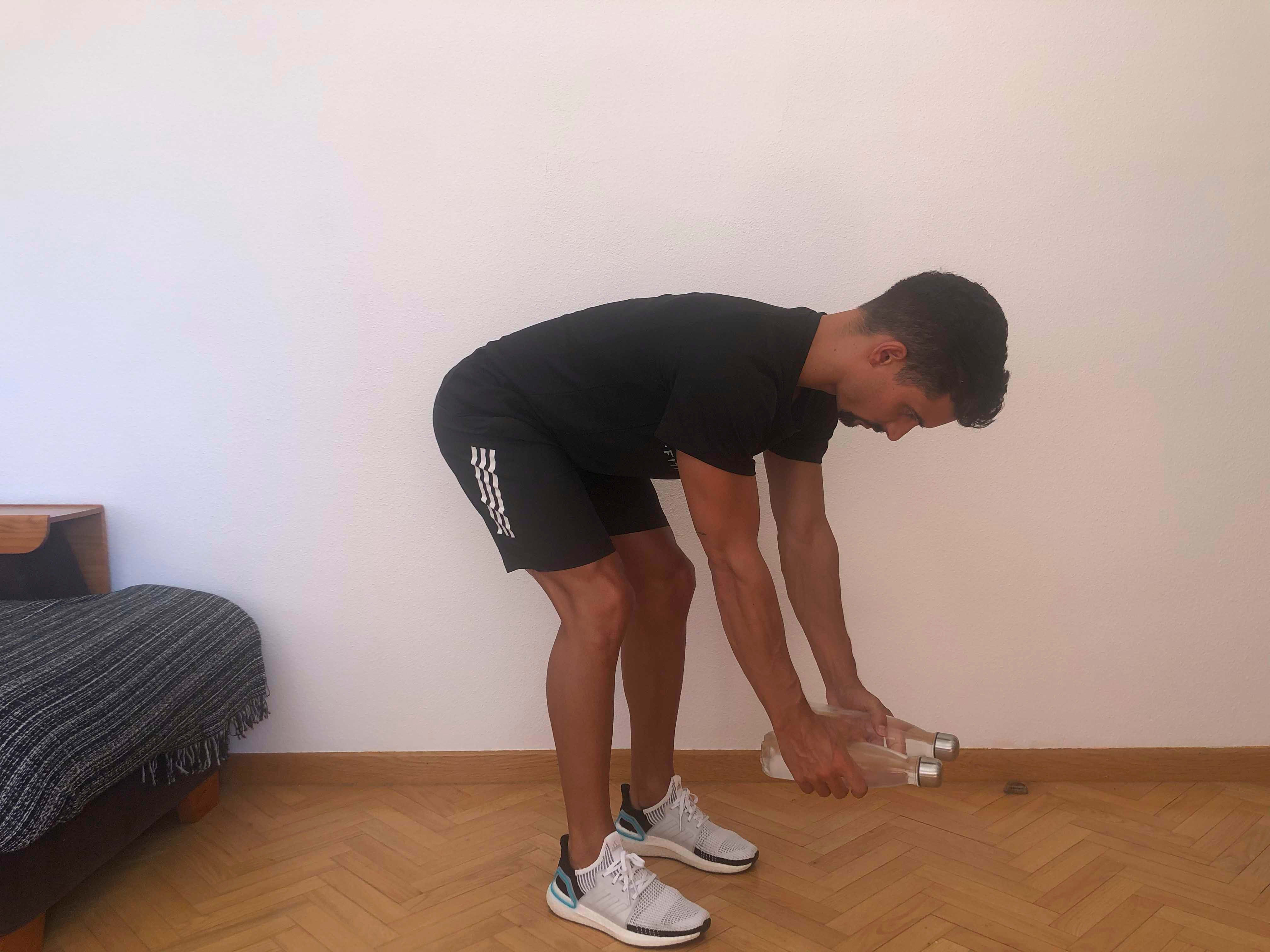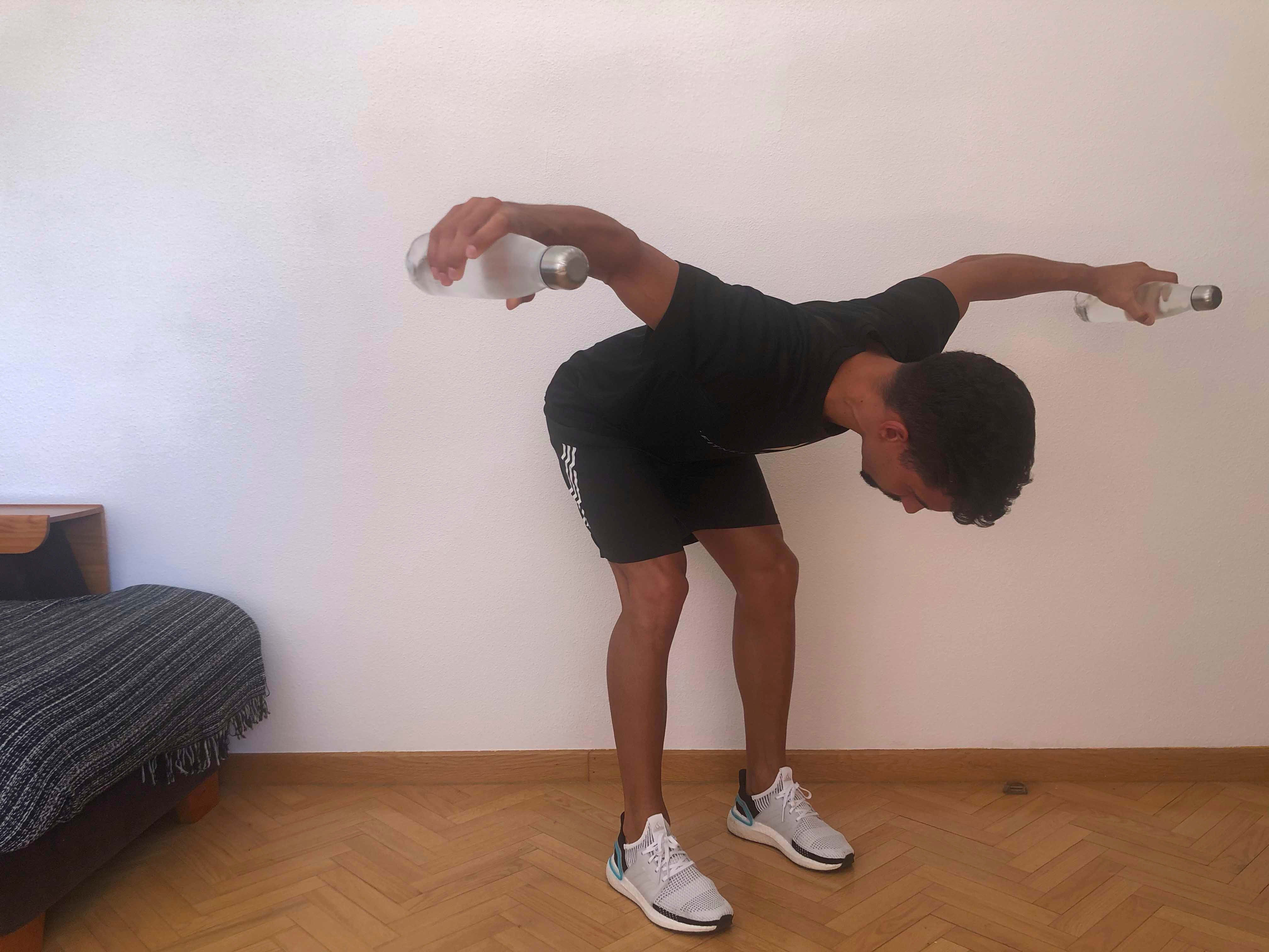 Nos metemos directamente a trabajar la parte posterior de los hombros con los pájaros. Con una técnica correcta trabajaremos prácticamente toda la musculatura de la espalda superior. Para ello vamos a utilizar dos botellas de agua. Realiza una flexión de cadera acompañada por una semi flexión de rodillas para liberar tensión en tu zona lumbar. La apertura de brazos también debe ir acompañada con una semi flexión de codos, hasta que consigas conectar tus escápulas.