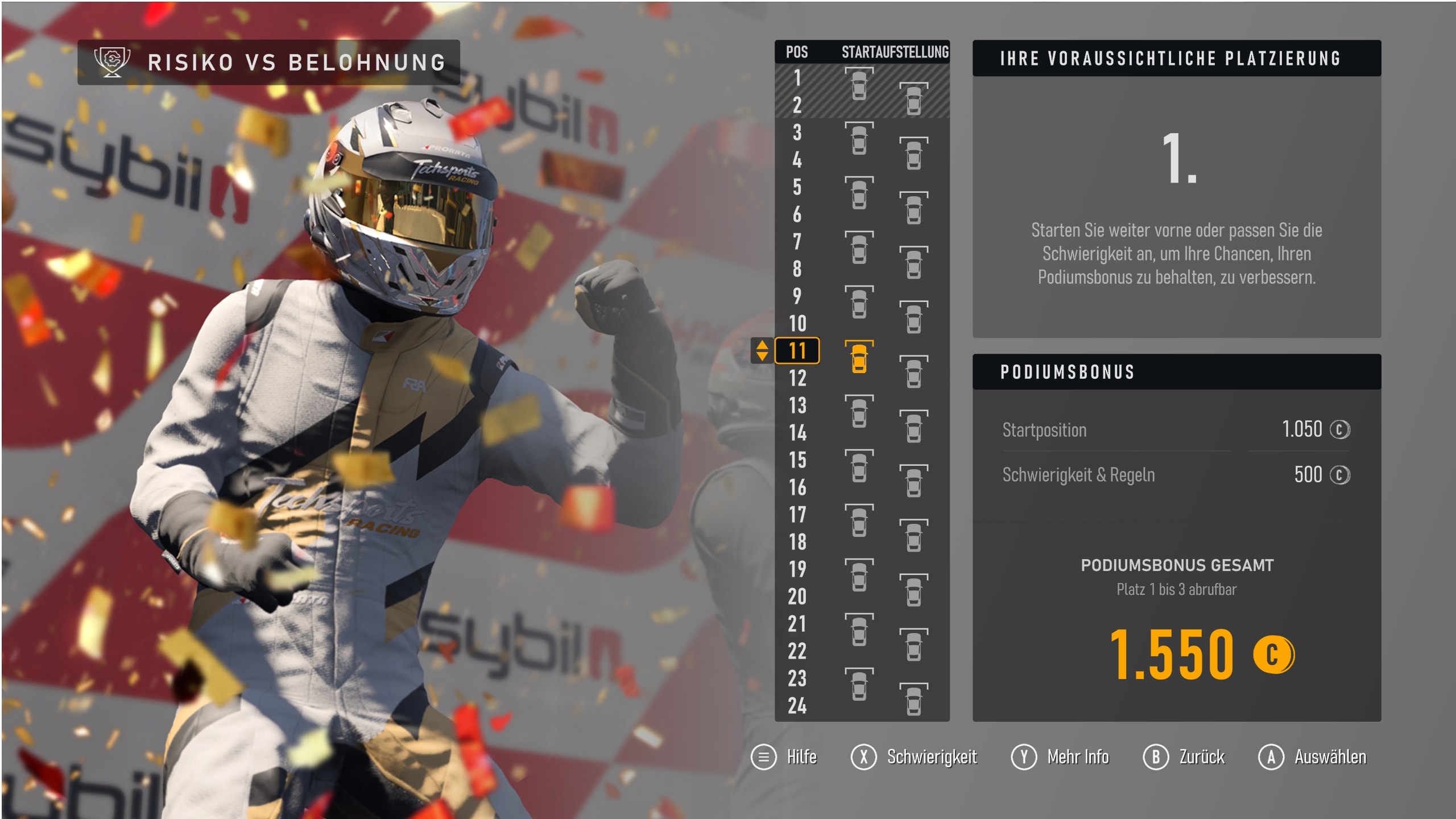 Si empiezas más atrás, puedes esperar muchos más créditos que si empiezas la carrera desde la pole position. Al mismo tiempo, sin embargo, aumenta el riesgo de acabar en el podio en las pruebas, que al principio son bastante cortas.