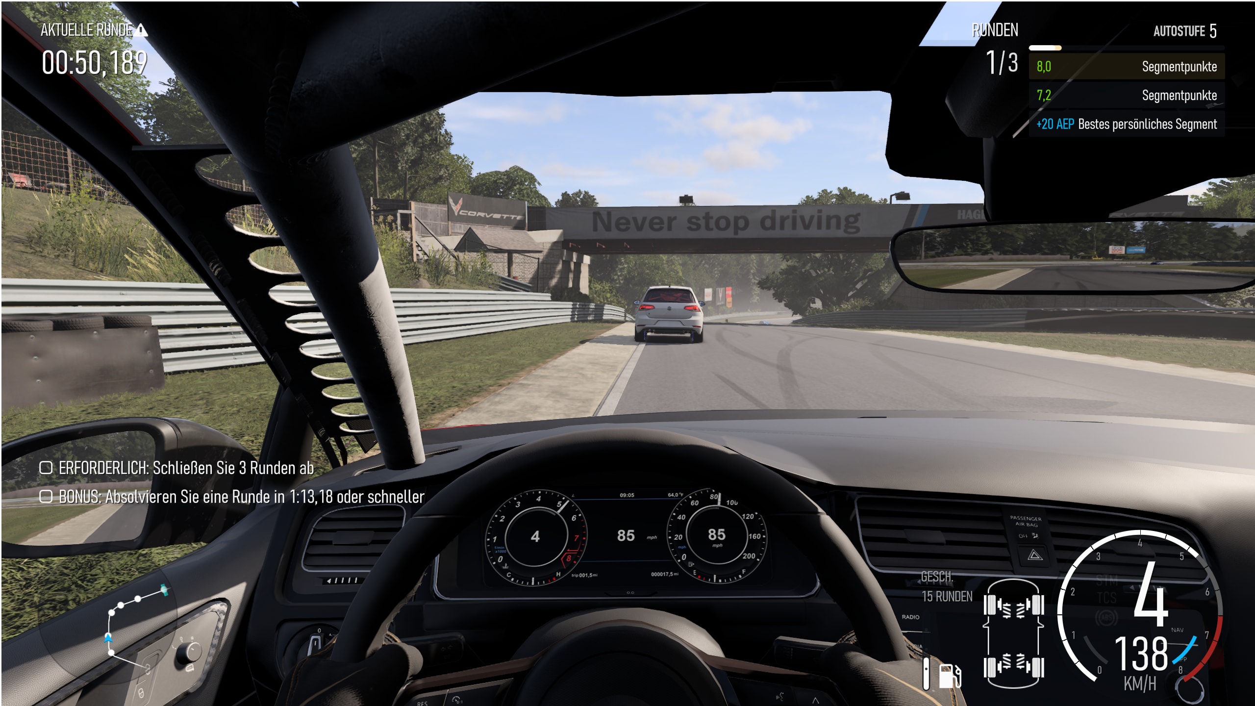 Si esto es cierto o no, es difícil de responder. En cuanto a la conducción, Forza convence en todos los ámbitos. La simulación del peso del vehículo también gana puntos, lo que se nota especialmente cuando las fuerzas centrífugas tiran de tu coche hacia fuera en curvas cerradas.