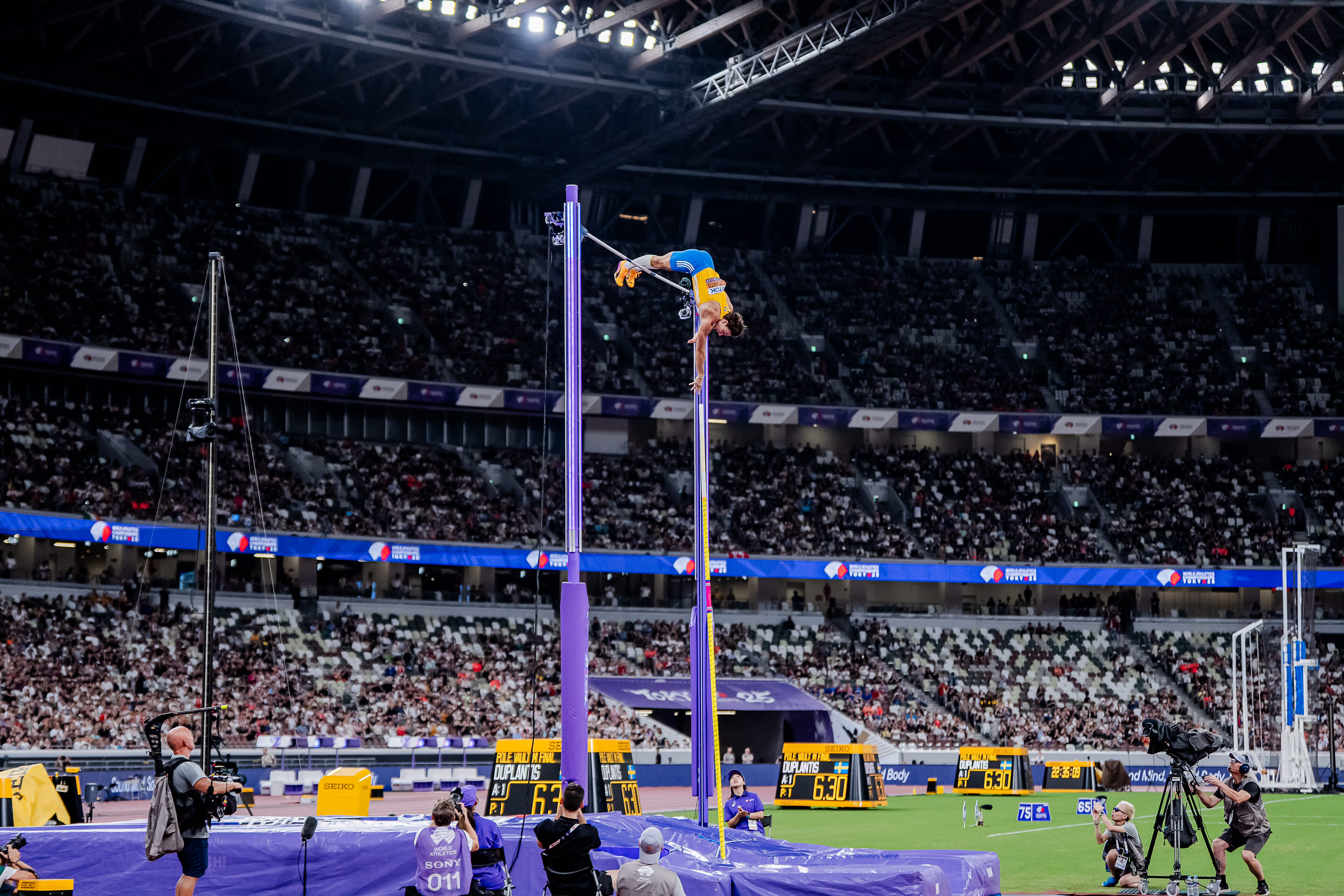 - Salto con pértiga: En el salto con pértiga, los atletas utilizan una pértiga flexible para impulsarse por encima de una barra horizontal elevada. El objetivo es saltar por encima de la barra a alturas cada vez mayores hasta que solo quede un atleta en pie. Al igual que en el salto de altura, los competidores tienen tres intentos para superar cada altura. Armand Duplantis, que ha batido 14 veces el récord mundial de salto con pértiga, es quizás el mejor atleta de pista y campo del planeta en la actualidad y estableció un nuevo récord de 6,30 m en su camino hacia la tercera medalla de oro consecutiva en el Campeonato del Mundo de Atletismo de 2025 en Tokio, Japón.