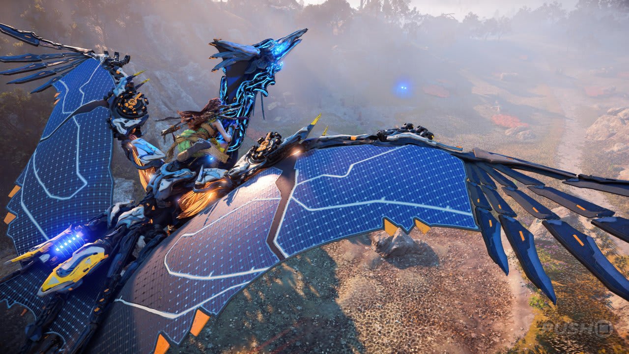 La mejor montura con diferencia es el Sunwing volador, el robot pteranodonte que puedes encontrar encaramado en unos cuantos lugares. La capacidad de volar hace que moverse por el mapa sea extremadamente fácil, y también puedes simplificar algunas misiones o puzles volando hacia ellos desde arriba en lugar de escalarlos desde el suelo. El Sunwing es la montura más rápida, por supuesto, y facilita el acceso a algunos de los lugares más difíciles del mapa. Sin embargo, no es un gran luchador, y puede resultar duro cuando lo montas en territorio hostil.