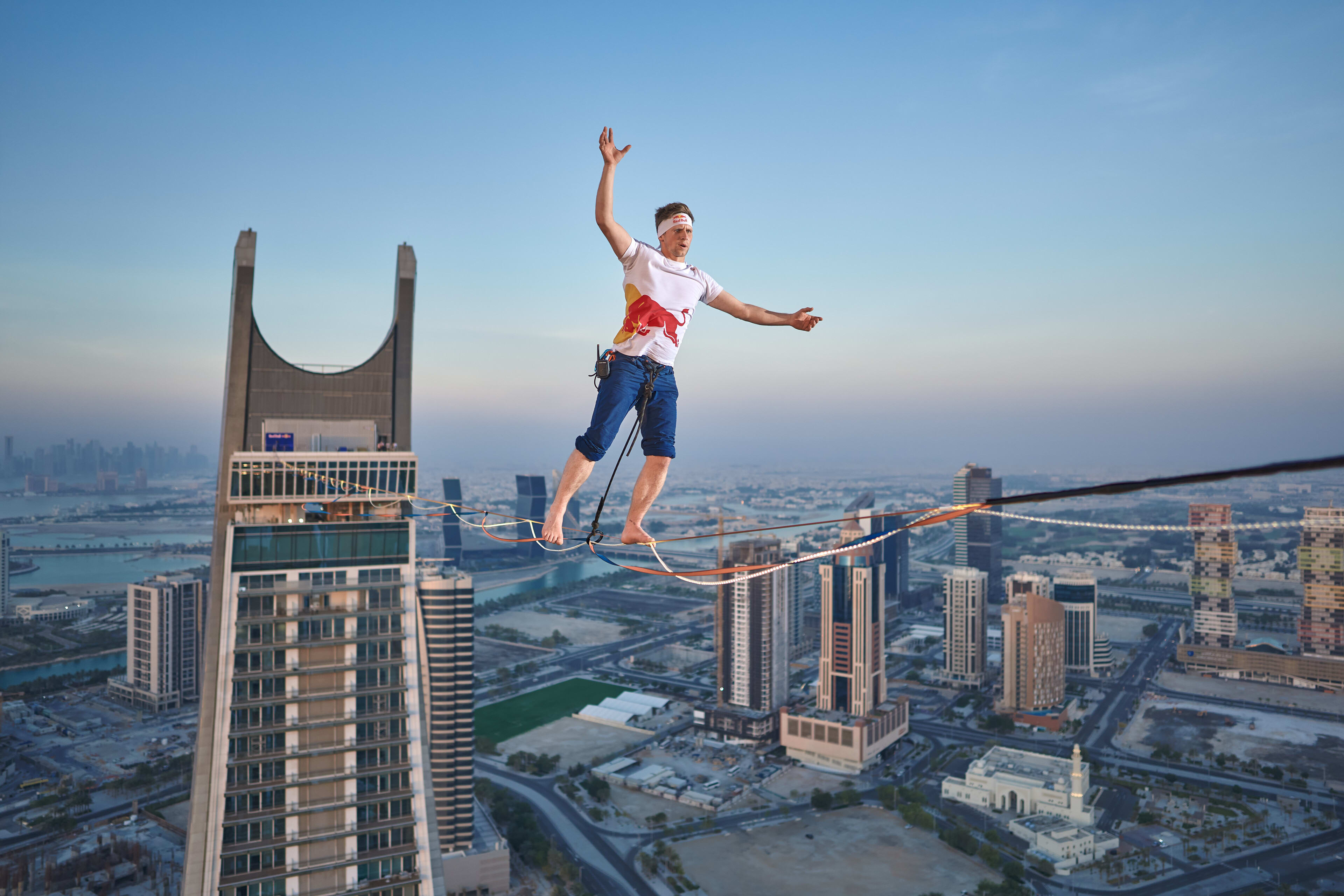 Jaan Roose hace slackline entre dos edificios en Doha, Qatar