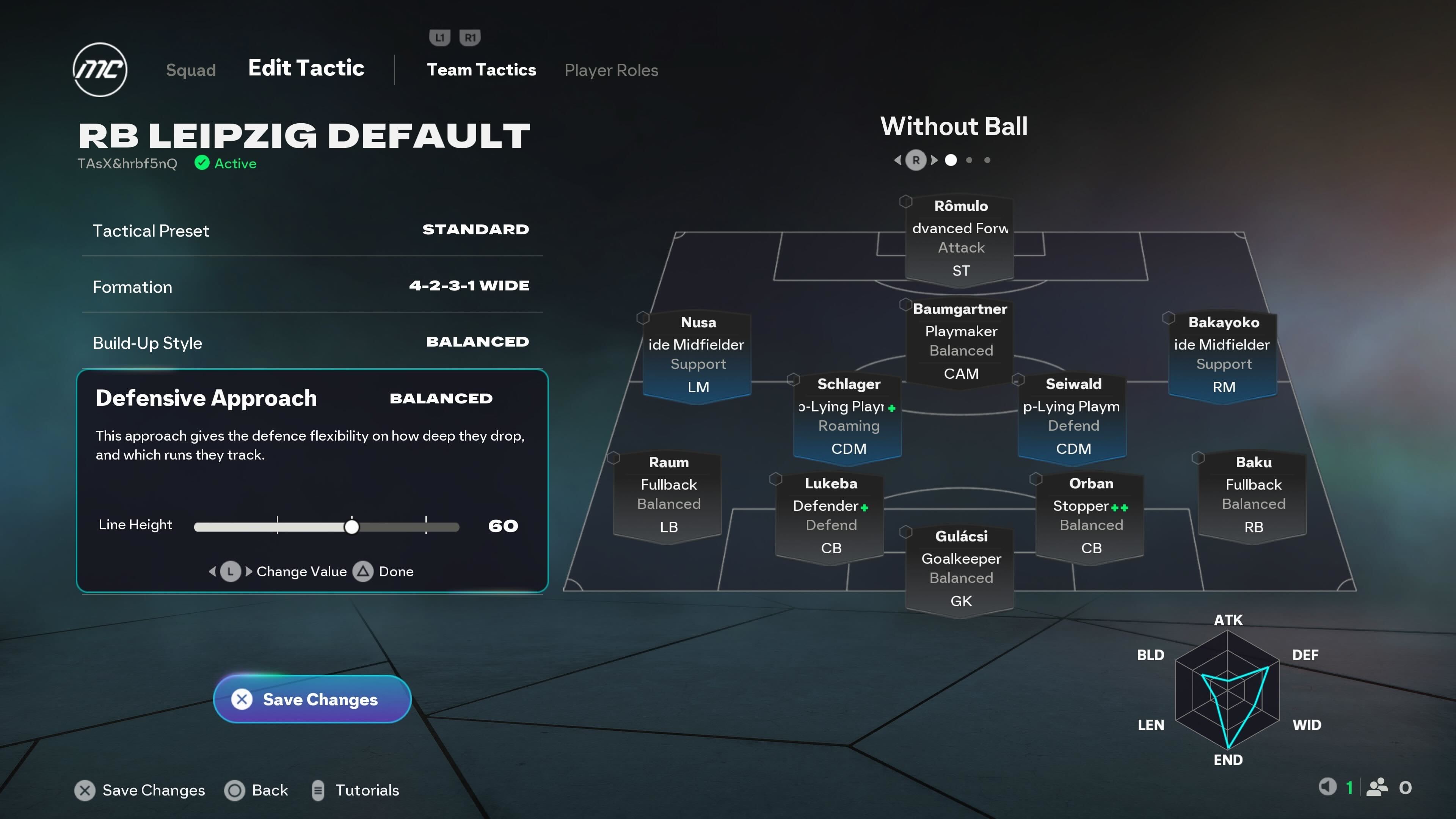 El ajuste personalizado 60 para el planteamiento defensivo es el más alto que puede tener tu línea defensiva sin asumir riesgos innecesarios. Esto significa que limitarás el espacio que tu oponente tiene en el centro del campo, al tiempo que seguirás a los corredores que vayan más allá en lugar de intentar un fuera de juego y posiblemente permitir una carrera fácil hacia la portería.