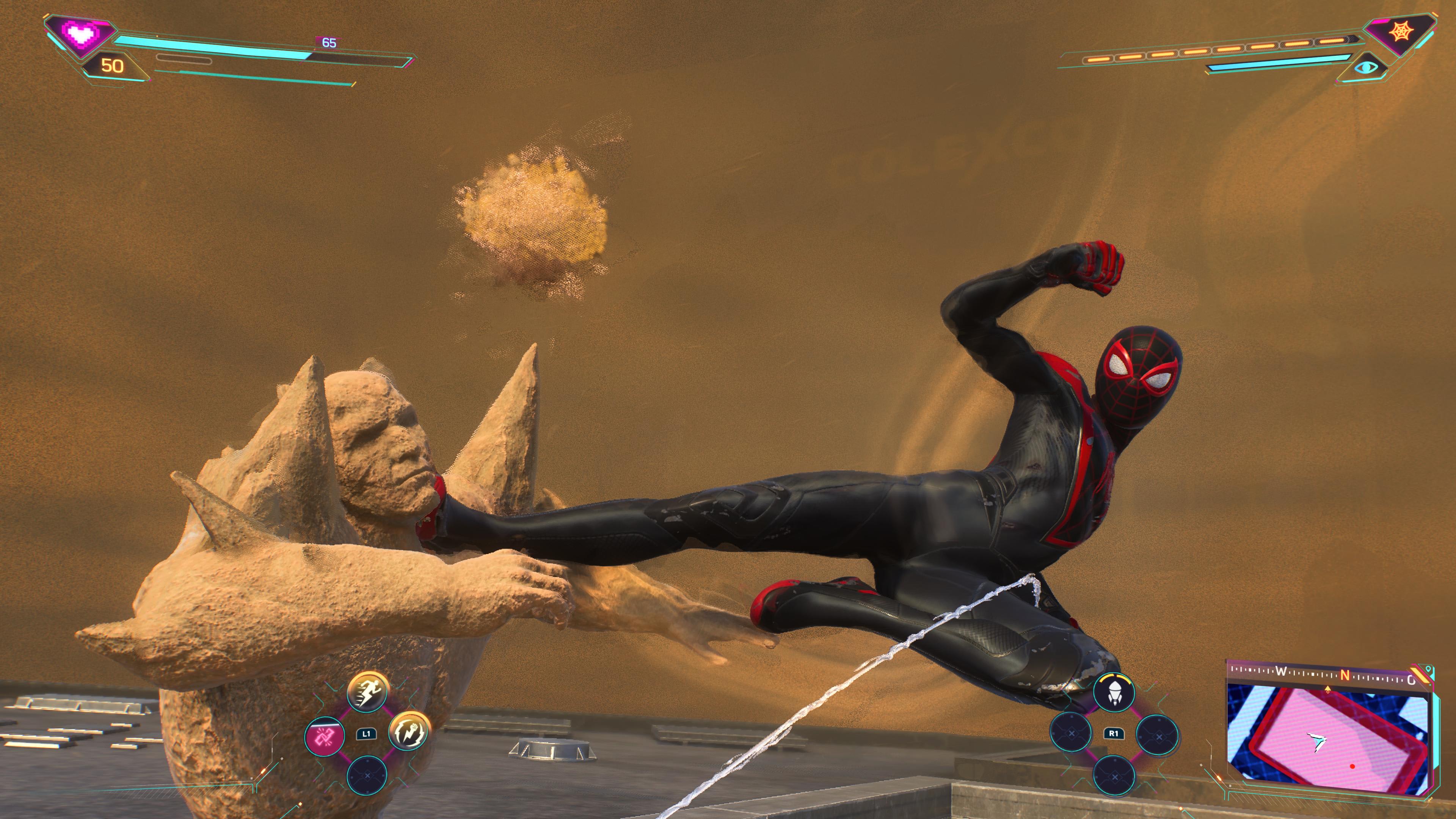 Una novedad es que ambos spideys pueden equiparse con cuatro ataques especiales cada uno, que puedes desatar en combinación con el botón L1. Sin embargo, para evitar que estos poderosos ataques lo destruyan todo, no puedes usarlos todo el tiempo.