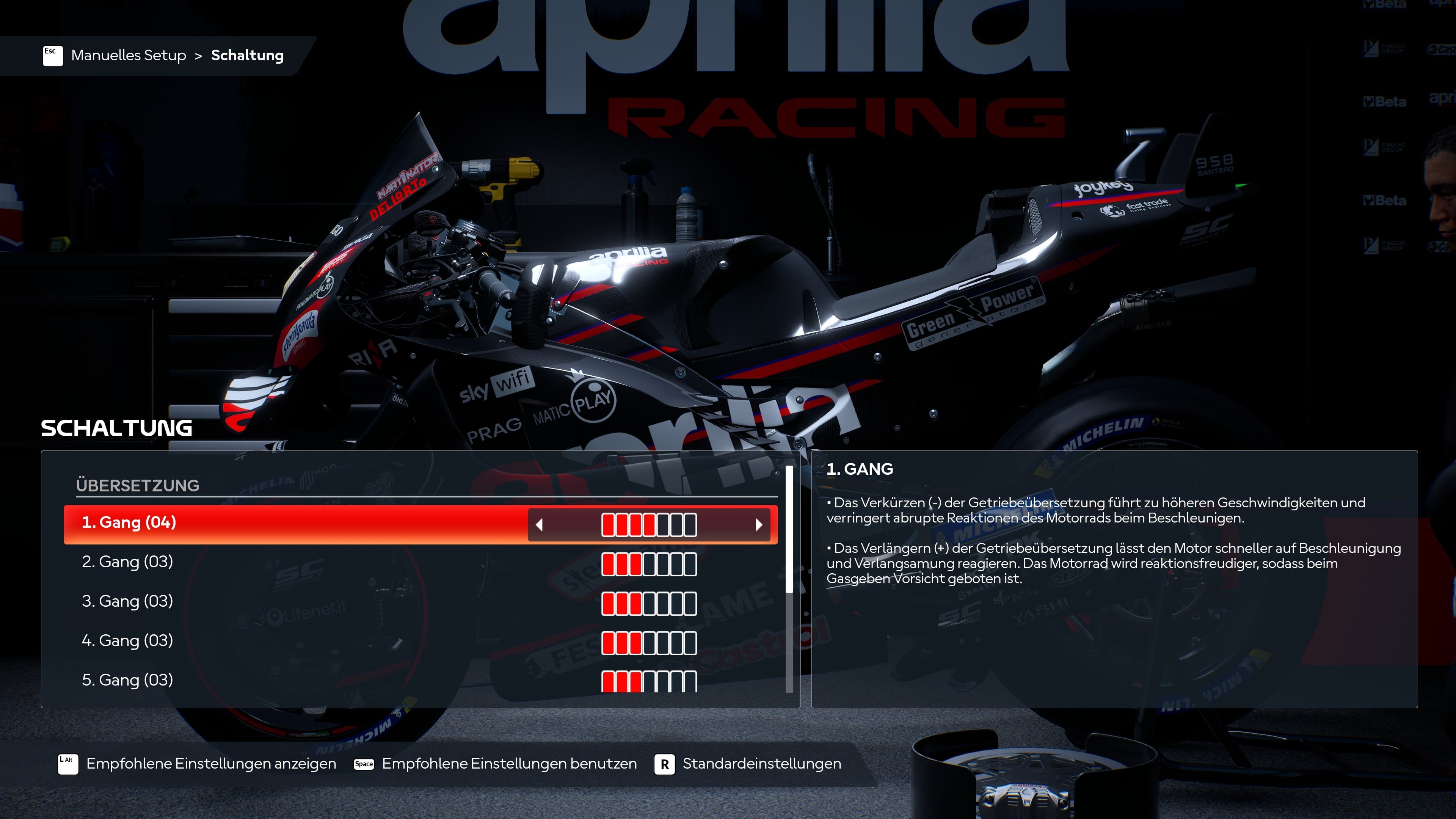 Los principiantes también estarán encantados de que el juego te ofrezca opciones recomendadas. Por ejemplo, si notas que la moto es demasiado inestable en la rueda trasera, puedes contrarrestarlo aquí. A continuación, el ingeniero de carreras ajusta la configuración de acuerdo con las especificaciones.