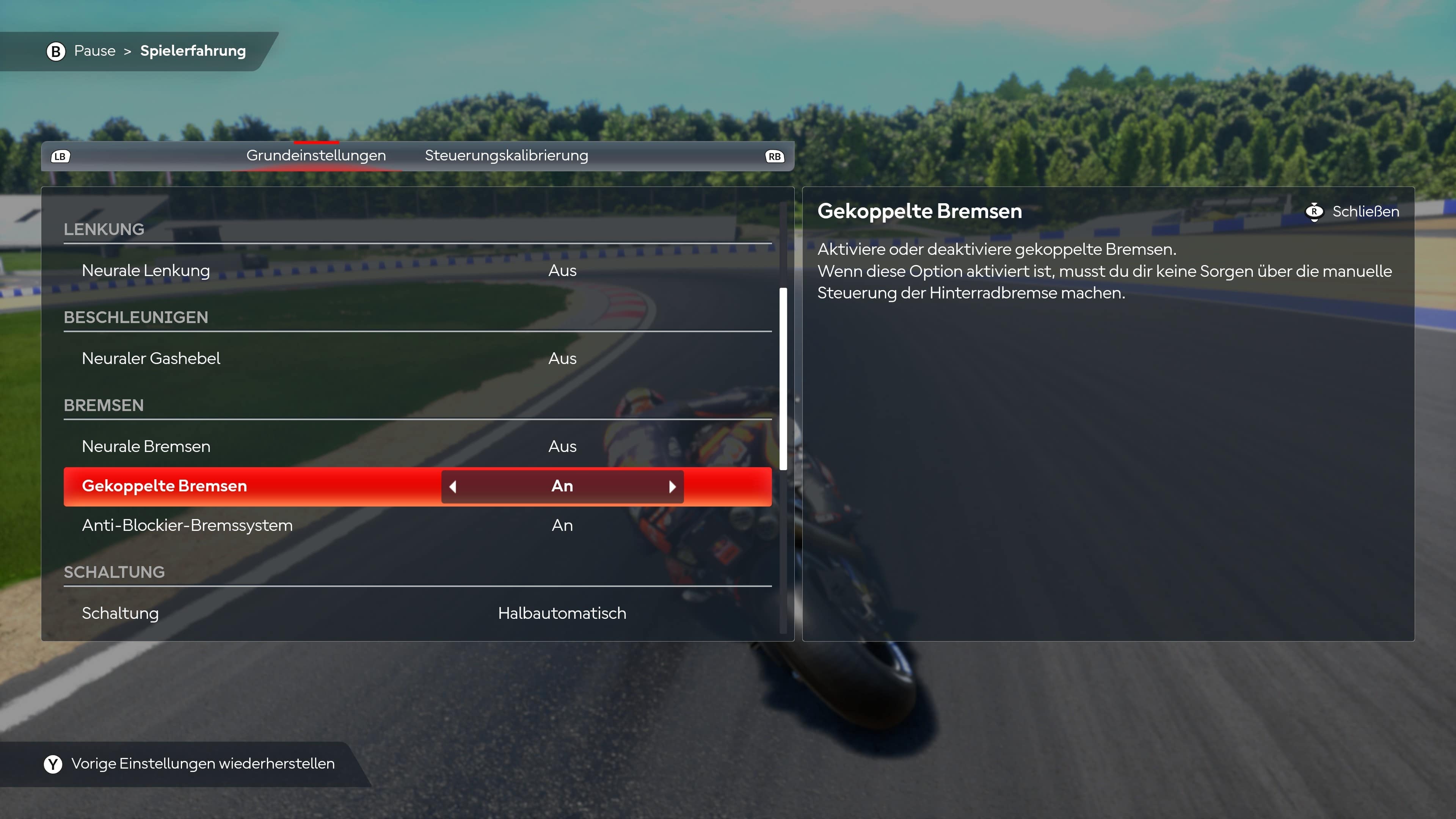 Los "frenos acoplados”, por ejemplo, son completamente diferentes. Como su nombre indica, esta opción te permite accionar los frenos delantero y trasero al mismo tiempo; en los juegos de MotoGP, estos son en realidad dos botones diferentes. Esto significa que ya no tienes que preocuparte por la distribución de los frenos.