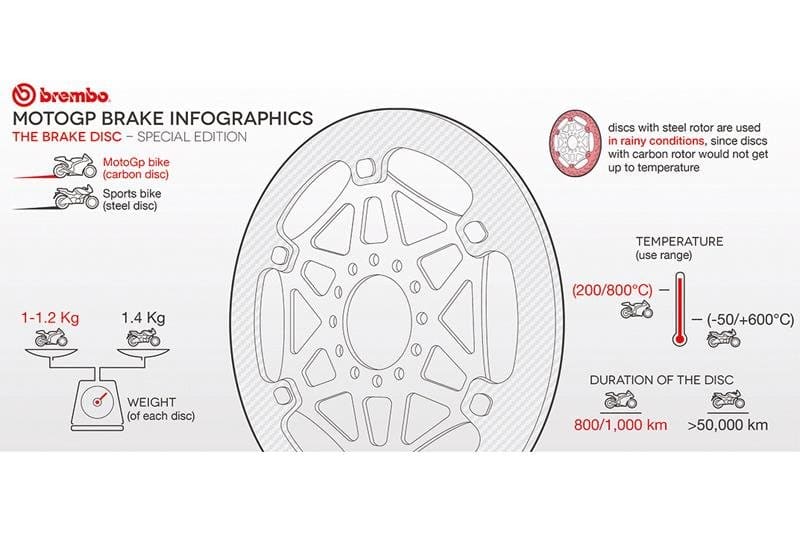 Los discos de freno metálicos son suficientes para las motos de carretera, pero un piloto de MotoGP tira de la palanca de freno hasta un 30% del tiempo de carrera. La solución son los discos de freno carbonocerámicos para la rueda delantera. Dependiendo de la pista, miden hasta 355 mm de diámetro, son más ligeros y pueden soportar temperaturas mucho más altas: 800 en lugar de 600 °C sin desvanecerse. En lluvia, sin embargo, se utiliza acero, ya que el carbono no alcanzaría la temperatura de funcionamiento. Por cierto, el ABS, que ahora es estándar en la producción en serie, no existe en MotoGP.