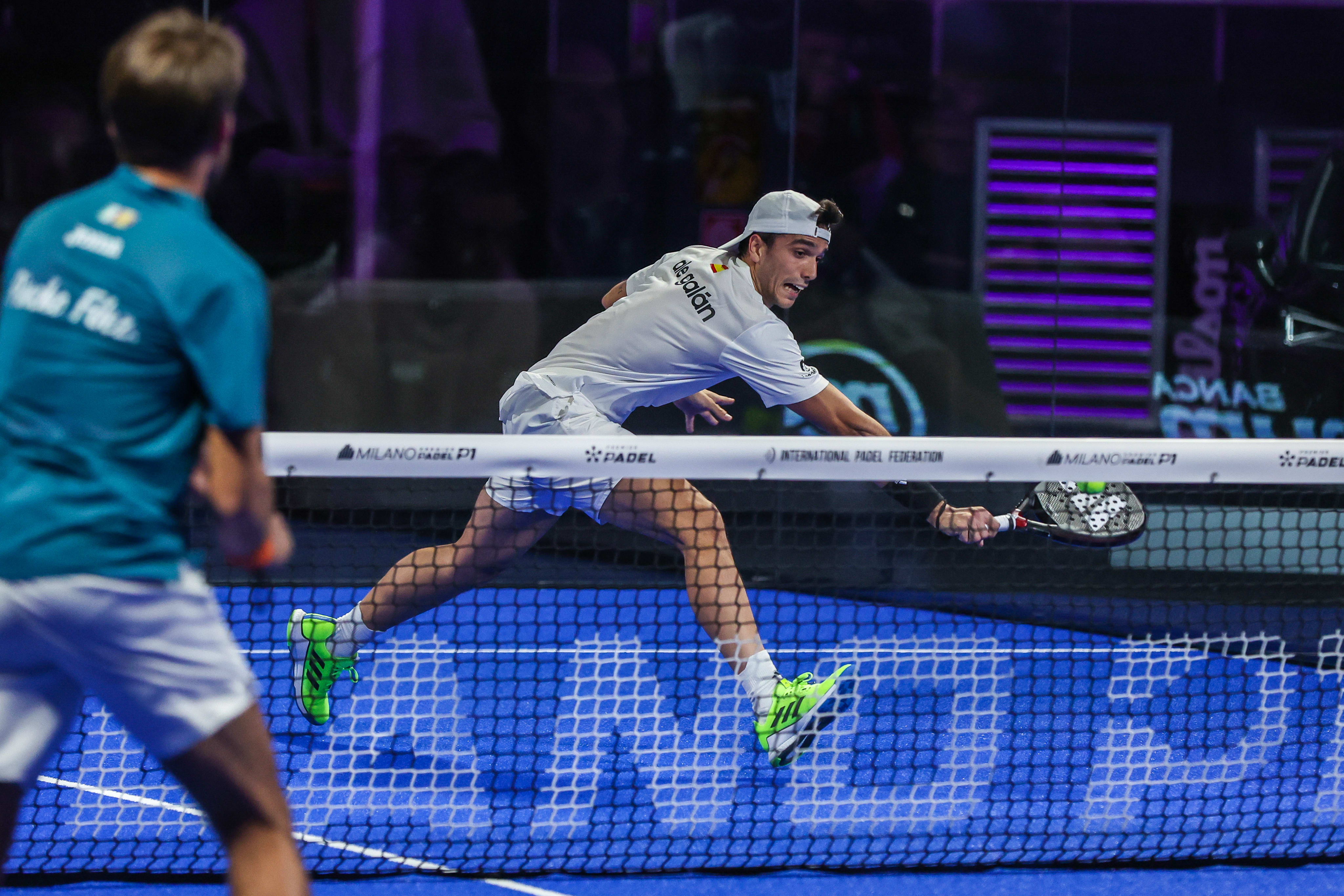 Alejandro Galán en acción durante el partido de Milano Premiere Padel P1 entre Juan Lebron (ESP)/Alejandro Galan (ESP) vs Antonio Fernandez (ESP)/Gonzalo Rubio (ESP) en el Allianz Cloud Arena.
