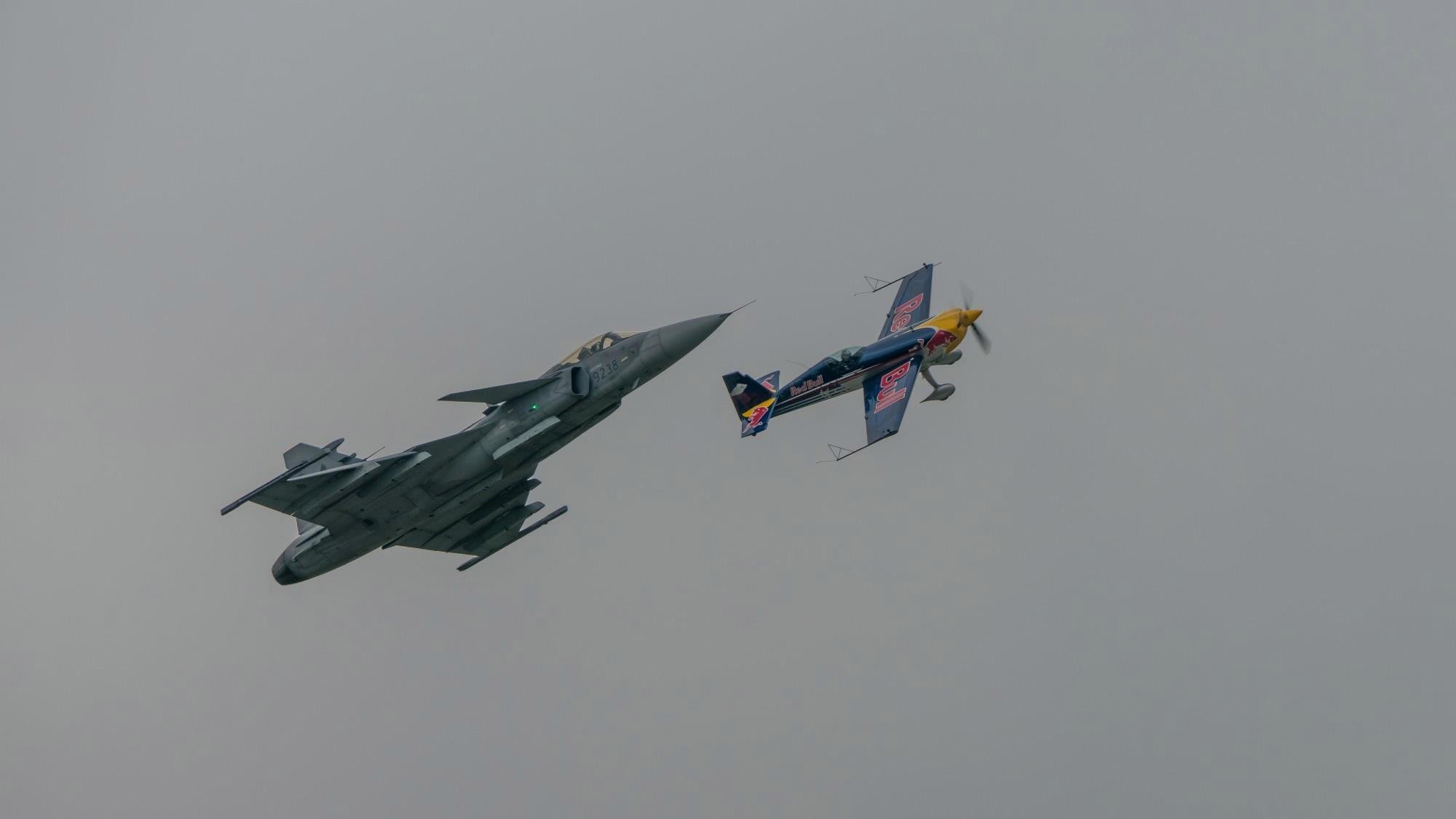 La exhibición acrobática realizada por Martin Šonka, campeón del mundo de la Red Bull Air Race 2018, e Ivo Kardoš, piloto de la Fuerza Aérea Checa, ha sido uno de esos momentos increíbles. Un vuelo en formación siempre es espectacular, pero lo es todavía más cuando se trata de un avión acrobático Extra 300SR frente a un caza Saab JAS-39 Gripen. David contra Goliat: David va a 400 km/h y Goliat tiene que hacer un gran esfuerzo para no alcanzar velocidades supersónicas.