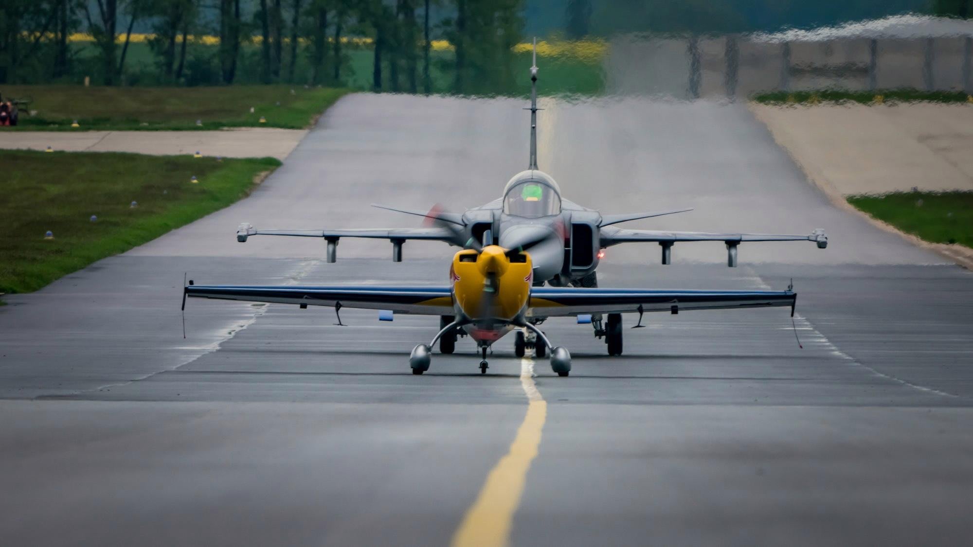 Sí, ¡el Gripen es ligeramente más rápido! Hay un margen muy estrecho en el que ambos aviones pueden volar juntos en lo que se refiere a la velocidad. El Gripen no puede volar muy lento y acelera muy deprisa, algo que no puedo hacer con el Extra. Soy capaz de ir a unos 400 km/h, lo que para el Gripen es muy lento.